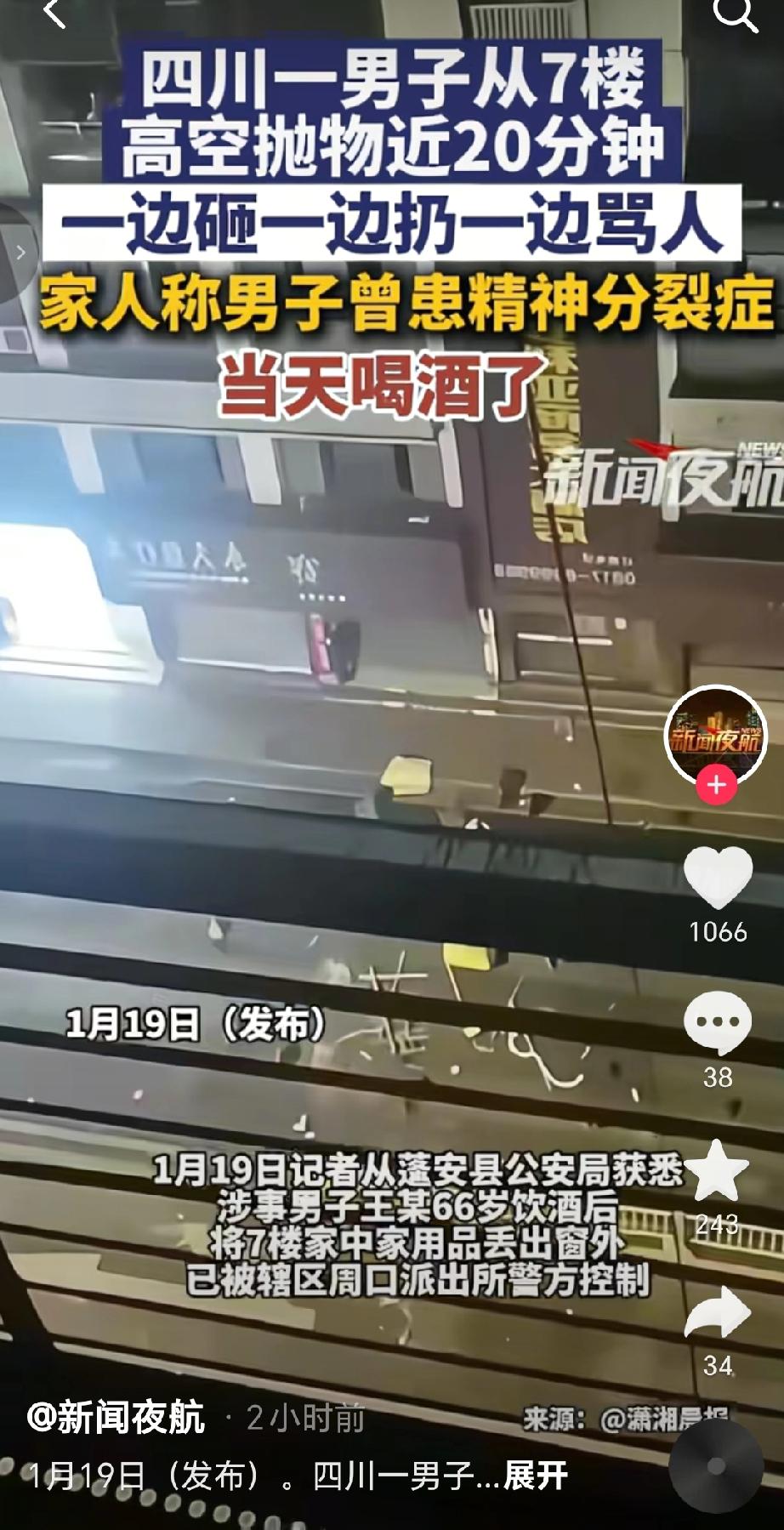 2026年1月19日,四川有一男子从7楼高空抛物,次数近20次,家人表示男子曾患