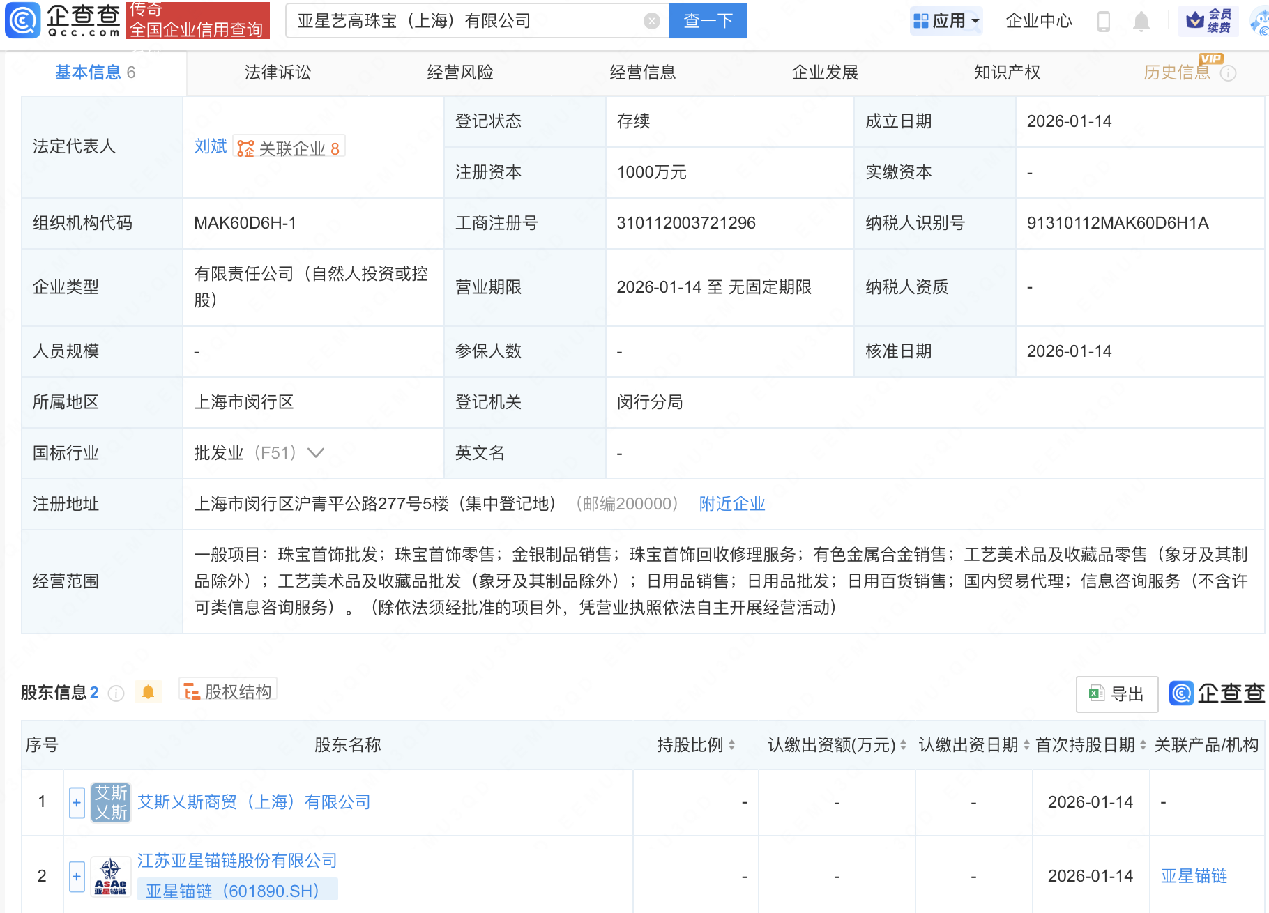 企查查APP显示,近日,亚星艺高珠宝(上海)有限公司成立,注册资本1000万元,经营范围包含:珠宝首饰批发;珠宝首饰零售;金银制品销售;珠宝首饰回收修理服务;有色金属合金销售等。企查查股权穿透显示,该公司由亚星锚链(601890)等共同持股。
