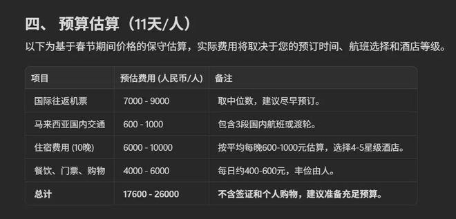 相比起来,Manus的行程预算偏高,但更接近春节出行的真实价格。