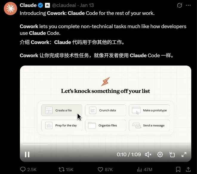 上周,Anthropic推出了他们的最新Agent产品ClaudeCowork。刚上线就被大伙儿一通狂吹,什么AGI真神降临,打工人的末日要来了。。。上次见到此等盛况,还是在Manus。