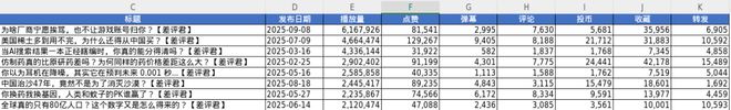 十五分钟后,它默默返回了一个Excel,里面的数据不仅包含一整年的所有83个作品,而且每条播放量、点赞、弹幕数、评论、投币、收藏、转发,全对。