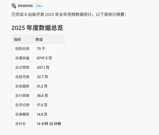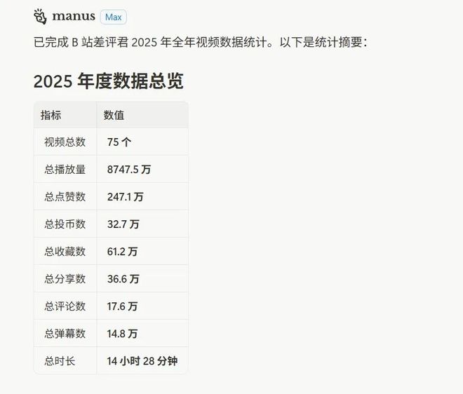 比如世超让它统计总结一下2025年差评君B站的视频数据,再把Excel直接喂我嘴里。