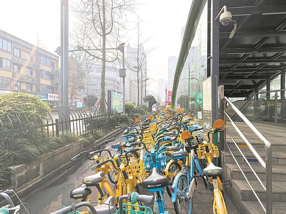 日前,记者来到太升南路地铁C出入口。站口外,密密麻麻的共享单车停放于此。