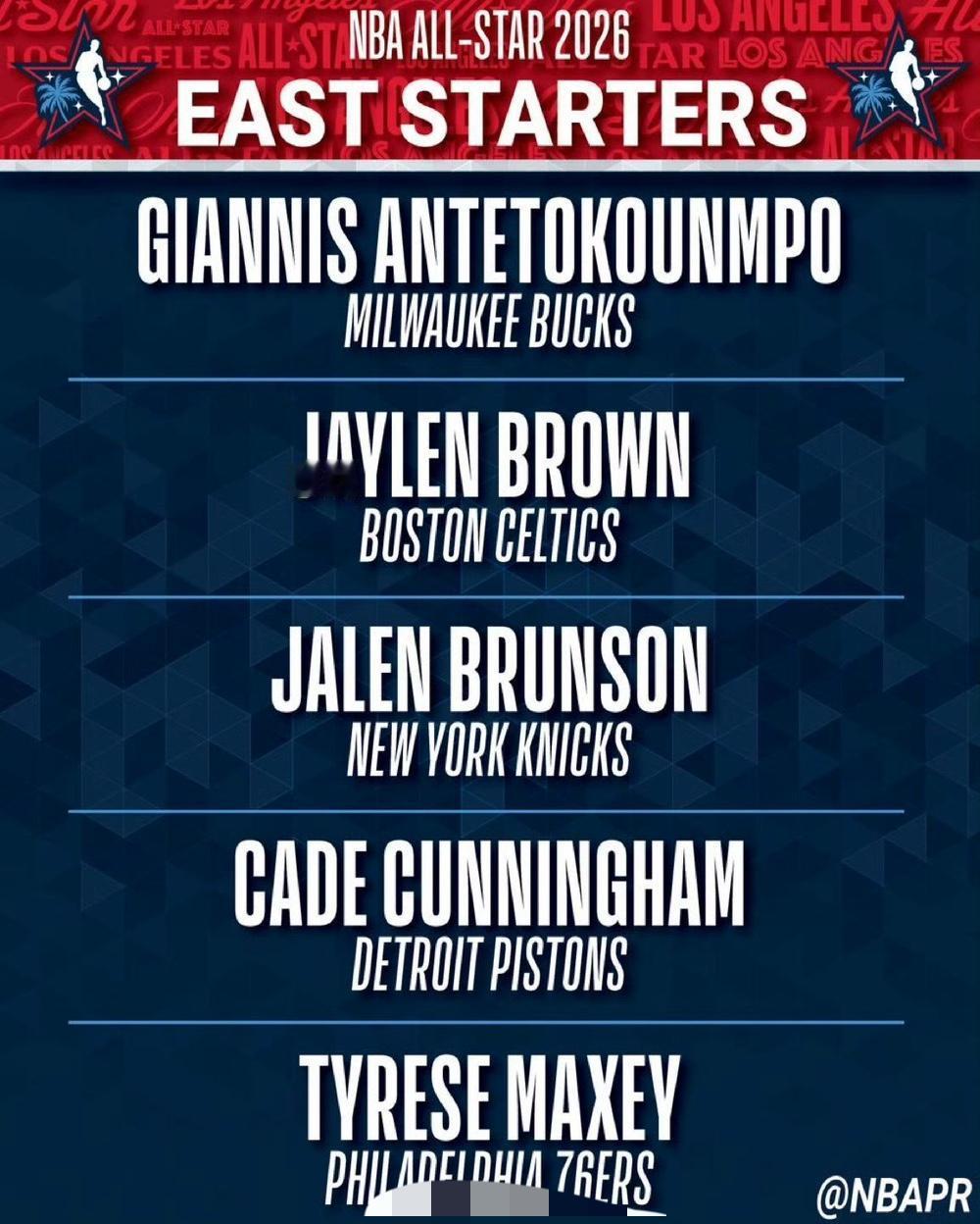 NBA全明星首发阵容揭晓,卢卡荣膺票王。 不过,今年比赛采用美国队对阵世界队的形式,因此真正的首发阵容,或许会将库里和字母哥的位置对调。 此外,詹姆斯在其21年的职业生涯中,首次无缘全明星首发。 西部首发 斯蒂芬·库里(金州勇士) 卢卡·东契奇(洛杉矶湖人) 谢伊·吉尔杰斯 - 亚历山大(俄克拉荷马城雷霆) 尼古拉·约基奇(丹佛掘金) 维克托·文班亚马(圣安东尼奥马刺) 东部首发 扬尼斯·阿德托昆博(密尔沃基雄鹿) 杰伦·布朗(波士顿凯尔特人) 杰伦·布伦森(纽约尼克斯) 凯德·坎宁安(底特律活塞) 泰雷斯·马克西(费城76人)