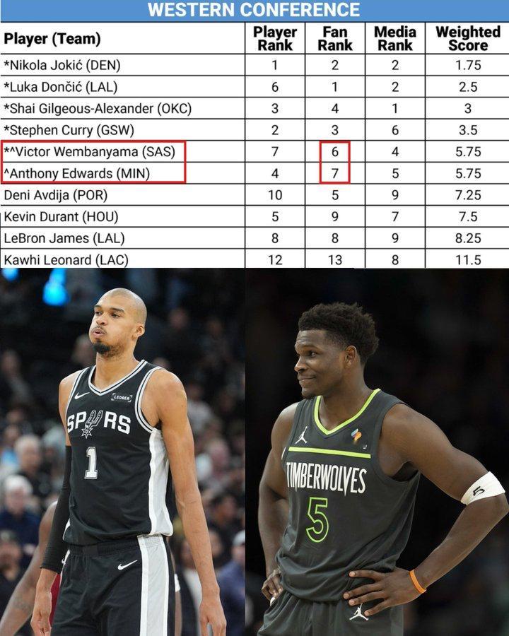 2026NBA全明星东部首发2026NBA全明星西部首发 谁没进全明星首发最可惜 文班亚马入选全明星首发,爱德华兹落选,两人三项得票排名加权积分都是5.75,但是文班亚马球迷得票第6,爱德华兹第7,而且文班仅仅了多了4505票球迷投票,真是险胜爱德华兹。