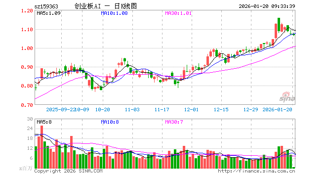 1月20日,创业板人工智能ETF华宝(159363)开盘涨0.00%,报1.071元。创业板人工智能ETF华宝(159363)重仓股方面,中际旭创开盘涨0.00%,新易盛跌0.41%,天孚通信跌0.89%,协创数据涨1.28%,软通动力涨0.33%,全志科技涨0.00%,深信服涨1.66%,北京君正跌1.42%,中科创达涨0.36%,景嘉微跌0.14%。