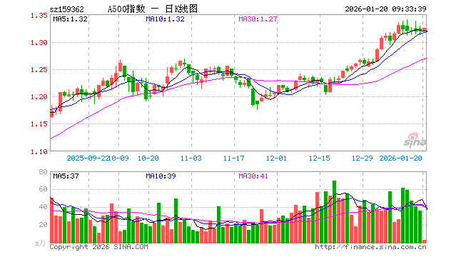 1月20日,A500ETF工银(159362)开盘涨0.00%,报1.319元。A500ETF工银(159362)重仓股方面,宁德时代开盘涨0.32%,贵州茅台涨0.25%,中国平安涨0.08%,招商银行涨0.05%,紫金矿业涨0.00%,新易盛跌0.41%,中际旭创涨0.00%,美的集团涨0.05%,东方财富跌0.04%,长江电力涨0.00%。