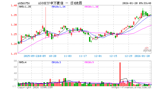 1月20日,A500ETF申万菱信(560750)开盘涨0.22%,报1.351元。A500ETF申万菱信(560750)重仓股方面,宁德时代开盘涨0.32%,贵州茅台涨0.25%,中国平安涨0.08%,招商银行涨0.05%,紫金矿业涨0.00%,新易盛跌0.41%,中际旭创涨0.00%,美的集团涨0.05%,东方财富跌0.04%,长江电力涨0.00%。