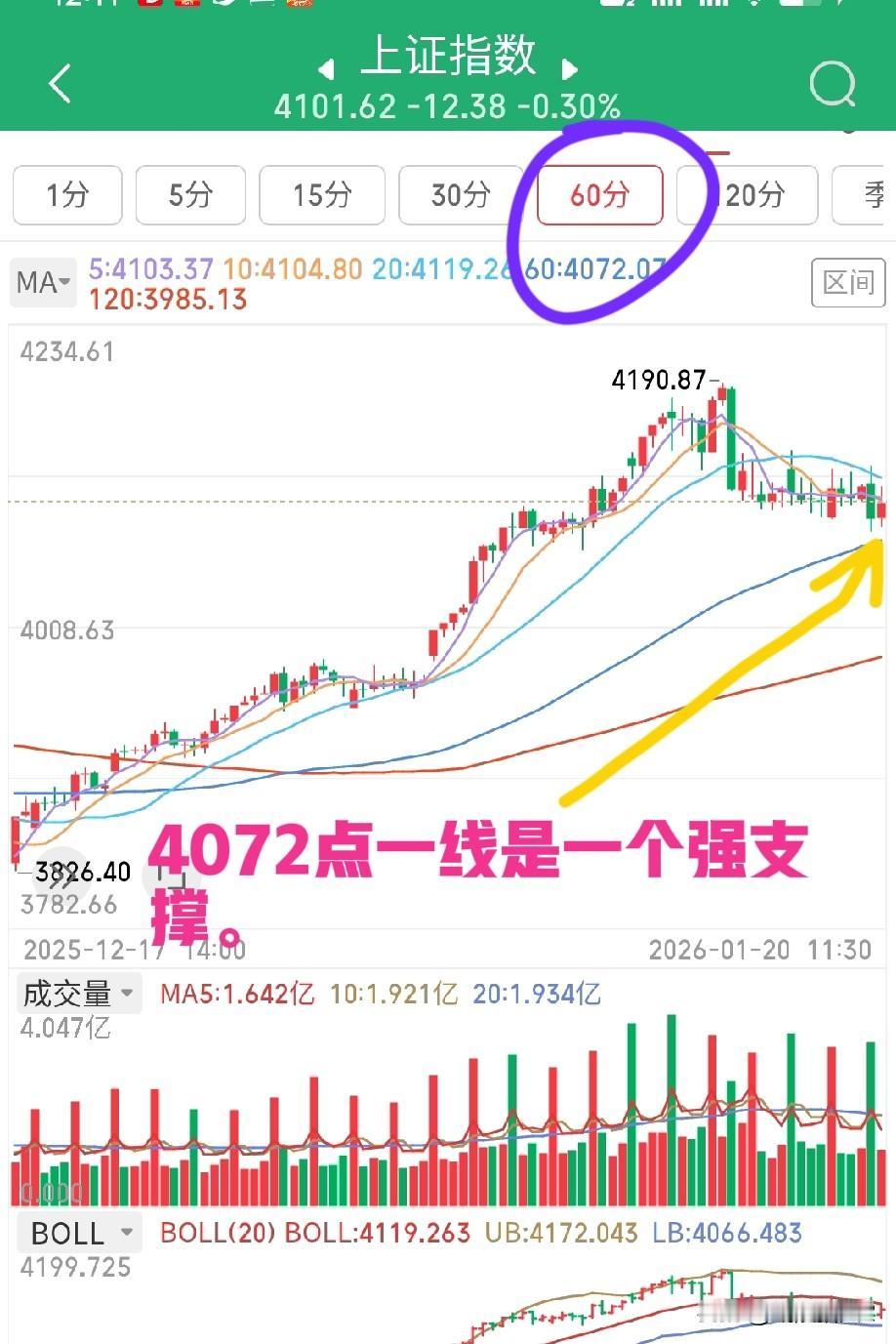 1月20日午评。两市上午放量大跌,下午还会不会继续大跌?散户朋友该何去何从? 两市上午高开低走然后一路震荡,市场温度骤降,管理层的意愿在逐步实行。今天的调整有点狠,让游资和散户知道什么叫投资有风险。 从沪指技术指标分析,目前指数延伸的是120分钟级别的调整(图1),对应的时间大约是12天左右,目前是调整第6天。当然,指数不会连跌12天,中间会有反弹,而且走势是震荡下行格局,管理层是不会让指数引起恐慌性失控的。从上午的走势看,120分钟K线收出了一根下跌陀螺线,预示指数还有调整空间。 那么,这个空间是多大呢?再从60分钟K线看(图2),4072点是一个强支撑,它是60周期60分钟K线的均线点位,指数到了这个位置一定会有反弹。 预计下午,指数还是呈震荡走势,不会一下跌太多。但是对于个股而言,情况可能就大不一样了,特别是前期高标股。所以,对于广大散户而言,控制仓位非常重要,该有格局的时候要有格局,该止损的时候就不能乱耍派头。 从宏观总体上看,指数很有可能是碎步小阴等待下方均线逐步上移,最后托起指数重新上行,从而完成一轮调整。 当然,我前面讲过最理想的调整是沪指调整到3600点再进行第二轮的5浪上涨结构,这不过是从最健康牛市的角度去分析的一种理想化的走势结构,我也知道不可能。就本轮调整而言,最大幅度也就是调整到前期高点4034点已经了不得了。 个人观点,不构成投资依据,不喜勿喷。祝大家下午好运。