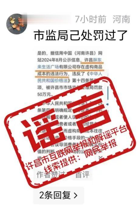 1月20日,许昌市委网信办官方公众号“网信许昌”发文辟谣,称经向市发改委和市市场监督管理局核实,许昌市胖东来商贸集团及旗下相关子公司,从未因“虚构商品成本”受到市场监管部门行政处罚,信用中国(河南许昌)网站公示内容中,无任何与该评论内容相关的处罚公示记录。网传信息为谣言。