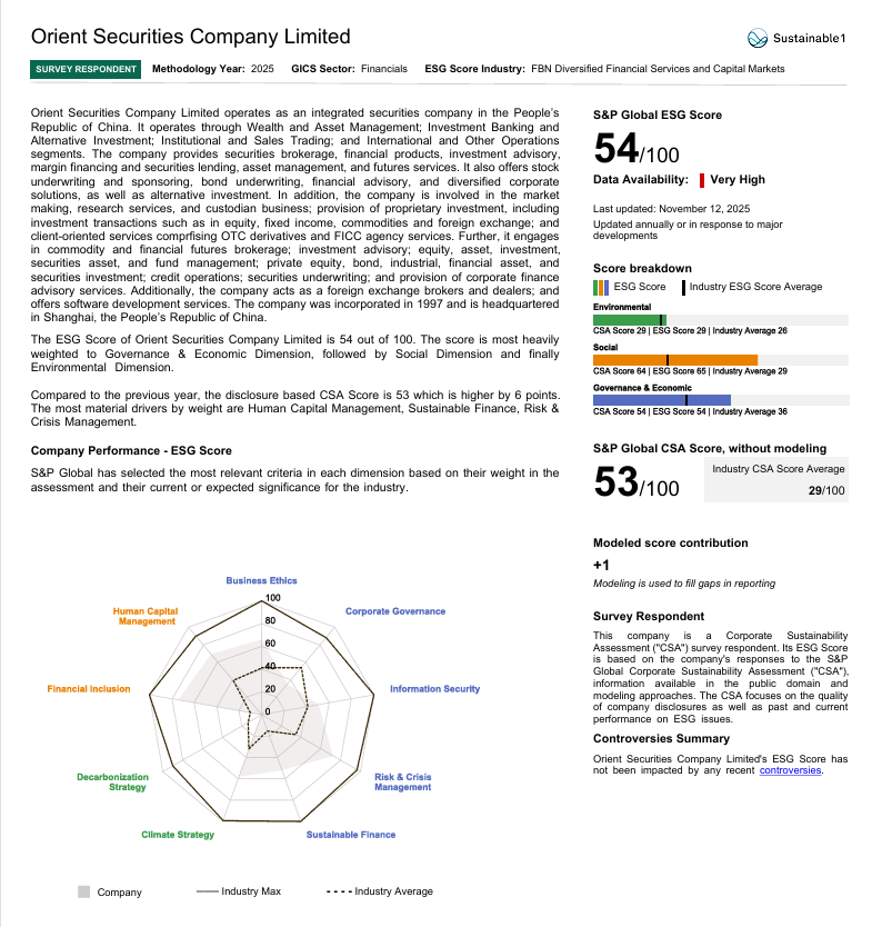 近日,国际评级机构标普全球(S&PGlobal)公布东方证券最新的企业可持续发展评估(CSA)得分。凭借在可持续发展领域的深耕与突破,东方证券CSA评估表现实现持续提升,2025年度CSA得分为53分,为目前已公布成绩的中国证券公司最高分。