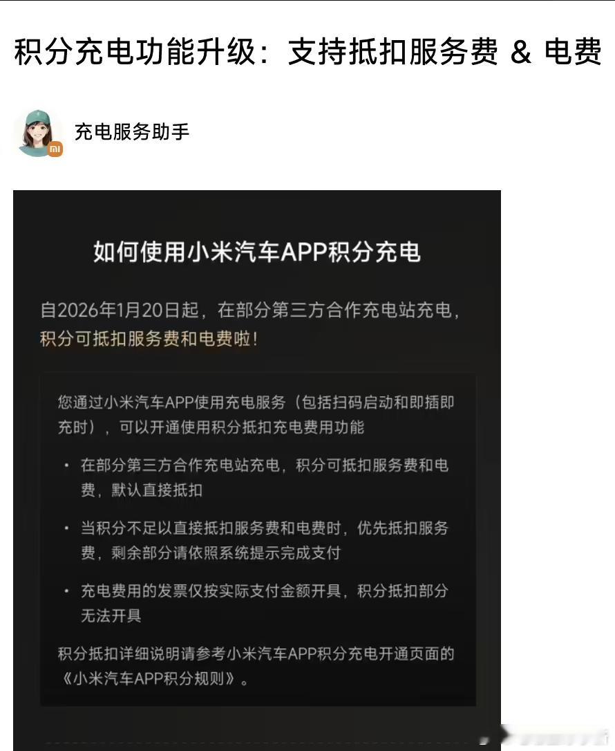 小米汽车积分充电功能升级:支持抵扣服务费 + 电费充电时系统自动优先使用积分抵扣全部费用,积分不足时优先抵扣服务费,剩余部分需用户自费支付;之前只能抵扣服务费,现在的话可以实现充电费用“双减免”小米汽车积分充电功能宣布升级小米汽车