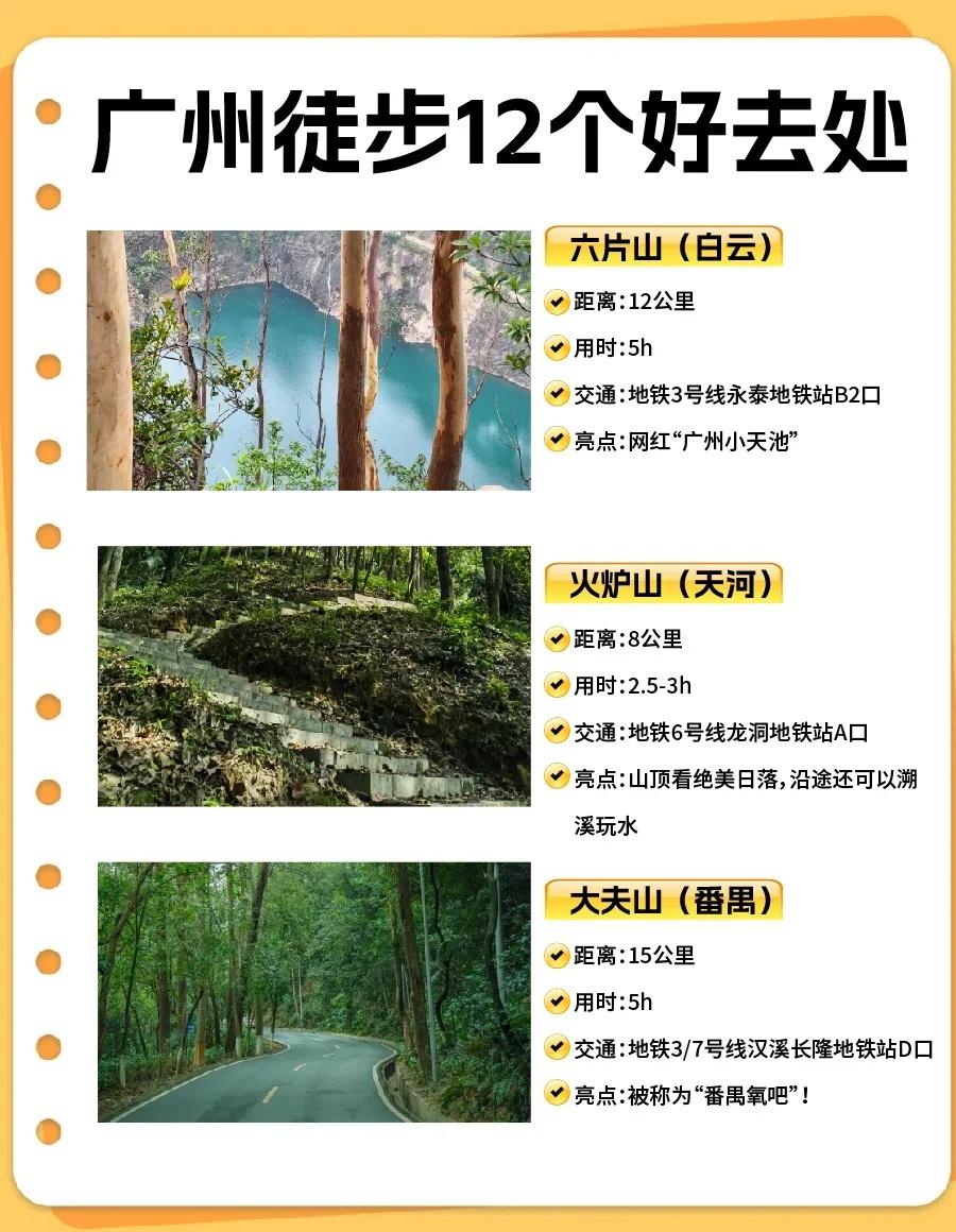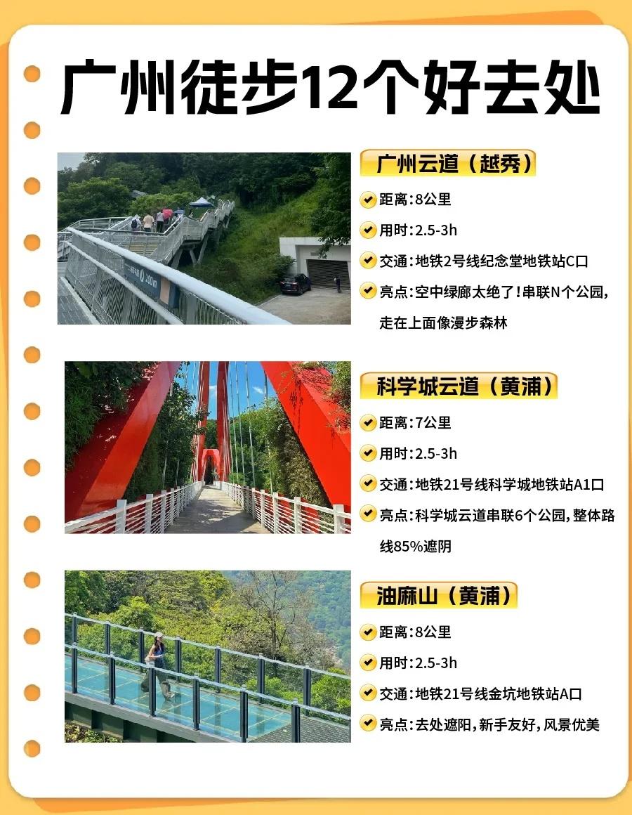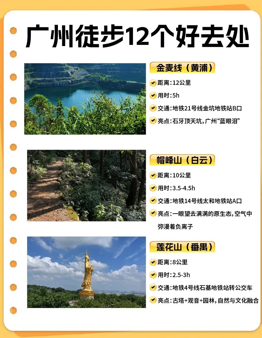 广州徒步攻略🌿12条路线新手也能冲! 宝子们!广州这些徒步线地铁直达,新手友好、出片率高,快码住约搭子出发! - 🌿广州云道(越秀) ➤ 8km|2.5-3h|2 号线纪念堂 C 口 ✨空中绿廊串公园,森系大片随手拍🌳 - 🌿科学城云道(黄埔) ➤ 7.5km|2h|21 号线科学城 A1 口 ✨人少清静,亲子遛弯超合适👨👩👧 - 💧六片山(白云) ➤ 12km|5h|3 号线永泰 B2 口 ✨“小天池” 蓝眼泪 + 悬崖机位,赞爆朋友圈💙 - ⛰油麻山(黄埔) ➤ 8km|3h|21 号线金坑 A 口 ✨树荫密不晒,清凉吸氧🌲 - 🌄火炉山(天河) ➤ 8km|3h|6 号线龙洞 A 口 ✨日落天花板,山顶瞰城景 + 小溪踩水🌅 - 💎金麦线(黄埔) ➤ 12km|5h|21 号线金坑 B 口 ✨石牙顶天坑 “蓝眼泪”,丛林探险感💧 - 🏞莲花山(番禺) ➤ 6-8km|3h|4 号线石碁站转公交 ✨古塔 + 观音像,祈福徒步两不误🏯 - 🌿大夫山(番禺) ➤ 10-15km|4h|3/7 号线汉溪长隆 D 口 ✨徒步 + 骑行,湖光山色适合闺蜜🚴♀️ - 🙏帽峰山(白云) ➤ 10km|3.5h|太和站 A 口打车 10 分钟 ✨原始森林,洗肺首选🌳 - 🍃黄麻线(黄埔) ➤ 10km|4h|21 号线长平 C3 口 ✨山林 + 溪流 + 田园,人少景美🌾 - ⛰凤凰山(天河) ➤ 6km|3h|6 号线柯木塱 C1 口 ✨市区隐秘线,易登顶、视野好👀 - 🌲白云山(经典) ➤ 10km|4h|11 号线云台花园站 ✨摩星岭看云海 / 日出,广州地标☁️ - 💡双节徒步 tips: ✅防滑鞋 + 速干衣 ✅驱蚊液 + 防晒帽 + 充电宝 ✅1L + 水 + 小零食 ✅部分路线需提前预约 ✨假期走进山野,解锁广州绿色浪漫💚 - 广州旅游 广州徒步 徒步路线 轻松徒步路线 徒步踏秋地图 广州徒步旅行好去处 一起徒步户外吧 白云山 徒步圈