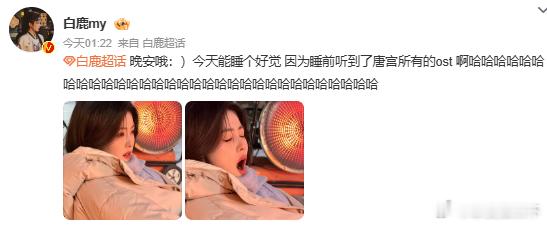 期待和李佩仪见面白鹿唱的唐宫奇案OST白鹿睡前听到了唐宫所有的OST别人还在猜唐宫 OST 数量,白鹿已经听完,更盼和李佩仪见面、盼歌手白鹿的 OST