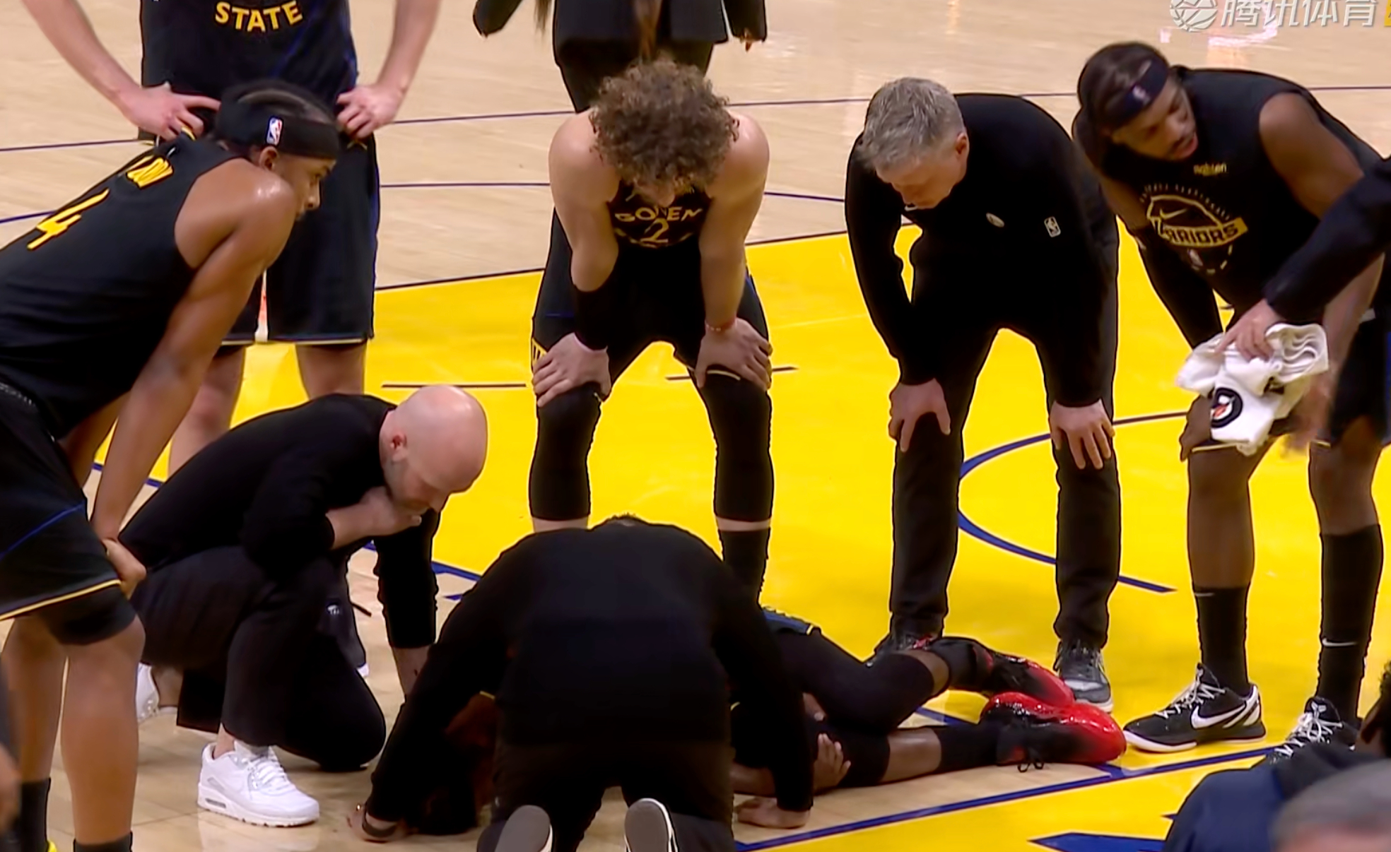 巴特勒膝盖受伤痛苦倒地 热火vs勇士 巴特勒这一下,科尔和勇士队友都围上来了,膝盖受伤不能自主行走,被队友搀扶离场