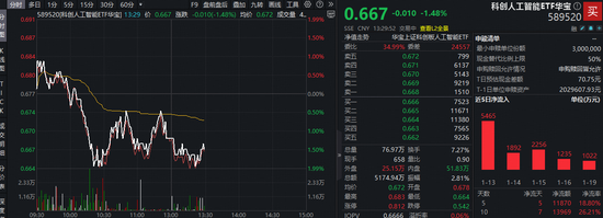 今日(1月20日)重点布局国产AI产业链的科创人工智能ETF华宝(589520)随市盘整回调,场内价格现跌1.48%,实时成交额超5100万元,交投火热!