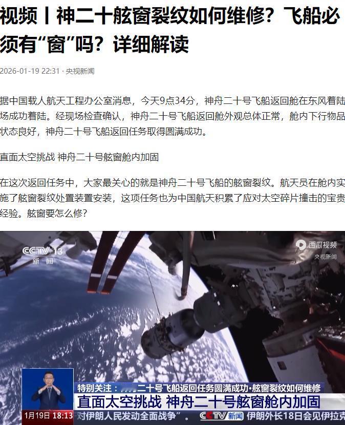 神舟二十号带回来的,不是一艘船,而是一座金矿。把那个“受伤”的返回舱完好无损地运回北京,价值远超十次完美的发射。那个裂了的窗户现在就是无价之宝,它是太空给中国航天出的最难考题,而我们把“试卷”和“答案”一起带回来了。以后怎么改、怎么防、怎么修,全看这道伤疤。这是用钱买不到的实战教训,是中国航天进阶路上的绝对垫脚石。 那条只有文字、没有画面的通报,看懂的人都会觉得脊背发凉——这是一种怎样的冷静。东风着陆场的风沙里,神舟二十号静悄悄地落地,仿佛什么都没发生过。 这种“零宣发”的处理方式,本身就是一种极度自信的展示。如果有哪怕一丝不可控的风险,或者飞船状态真的濒临崩溃,地面指挥中心绝对会调动一切资源进行紧急处置,而不是像现在这样,按部就班,甚至还有闲心把那个带伤的舷窗遮得严严实实,搞起了保密工作。 这说明什么?说明在工程团队眼里,哪怕窗户裂了,这依然是一次“受控”的任务,依然在安全冗余的覆盖范围内。 很多人可能好奇,一道舷窗裂纹而已,为何能被称作“无价之宝”?要知道,神舟飞船的舷窗可不是普通玻璃,而是三层复合结构的“保命窗”,最外层专门抵御返回大气层时上千摄氏度的高温烧蚀,里面两层还要兼顾密封和观察功能。 这次受损的正是最外层防热窗,看似只是一道裂纹,却精准击中了载人航天最核心的安全痛点——低地球轨道的空间碎片威胁。 人类目前只能监控厘米级以上的太空垃圾,毫米级微碎片根本无法预警,而这次撞击,相当于让中国航天在实战中摸清了这类碎片的破坏力,以及现有防护体系的短板。 更难得的是,我们不仅拿到了“试卷”,更交出了一套完整的“解题思路”。从发现裂纹到成功返回,整个过程步步为营,尽显中国航天的体系实力。 2025年11月初发现疑似撞击后,地面团队没有慌乱,先通过空间站机械臂和舱外相机细致勘察,再调取同款舷窗开展模拟试验,精准复现撞击场景和再入风险。 为了绝对安全,果断安排神舟二十号乘组换乘神舟二十一号返回,这是中国首次启动载人飞船乘组换乘机制,每一步决策都基于扎实的数据分析,没有丝毫侥幸。 而真正的体系考验,来自后续的应急补位。为了给受损的神舟二十号加装加固装置,神舟二十二号飞船开启了史无前例的应急发射流程——从接到指令到点火升空,只用了16天,这只是常规任务周期的三分之一。 要知道这不是简单的“加急发货”,而是涉及火箭、飞船、测控等多个系统的协同作战:长二丙火箭为腾出工位提前转场发射,电缆技术骨干放下碗筷连夜返场,48小时内排除故障;飞船团队同时推进五项任务,在并行作业中守住质量底线。 这种在小时刻度上跑赢时间的能力,比完美发射更能体现航天实力的成色。 对比国际航天史的教训,这份冷静和底气更显珍贵。苏联“联盟11号”因阀门故障全员遇难,俄罗斯“联盟MS-22”冷却剂泄漏后被迫长期在轨等待救援,这些事故都暴露了应急体系的短板。 而中国早已构建起“在轨冗余+地面热备”的双重保险,不仅有双船在轨、六人共驻的缓冲能力,地面还有随时待命的备份飞船和火箭,形成了“打一备一”的铁律。 这次事件中,从航天员安全撤离,到受损飞船加固返回,再到新备份船补位,整个链条无缝衔接,没有出现任何纰漏,证明这套体系完全经得住实战检验。 如今这具带伤的返回舱,承载的价值早已超越飞船本身。它带回的不仅有超期服役的舱外航天服、空间实验样品,更有最真实的撞击数据和防护测试结果。 航天科技团队已经明确,后续会针对性加强舷窗结构强度,优化微小碎片监视体系,把这次的教训转化为下一代飞船的防护能力。 毕竟太空探索从来不是靠完美的模拟就能规避风险,只有经历过真实的撞击、可控的故障,才能真正摸清太空的脾气,为更远的深空探测铺路。 东风着陆场的风沙散去,神舟二十号的“伤疤”成为了最耀眼的勋章。这种不张扬、重实效的风格,恰恰是中国航天最动人的特质——不追求表面的圆满,而是把每一次挑战都变成进阶的阶梯。 这道裂纹告诉我们,真正的强大从不是永不犯错,而是犯错后能从容掌控、举一反三。 未来,当中国航天迈向载人登月、深空探测,这次带伤归来的经历,必将成为照亮前路的宝贵财富,让每一步探索都走得更稳、更有底气。 信息来源: 1. 央视新闻《神二十舷窗裂纹如何维修?飞船必须有“窗”吗?详细解读》(2026年1月19日) 2. 中国航天报《神舟二十号飞船安全顺利返回东风着陆场》(2026年1月19日) 3. 中国航天科技集团有限公司官网《应急发射背后的航天力量》(2025年11月28日)