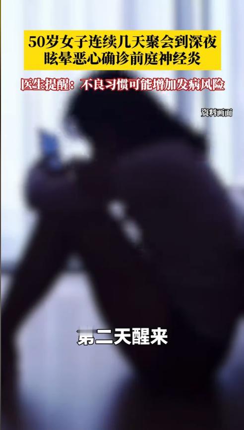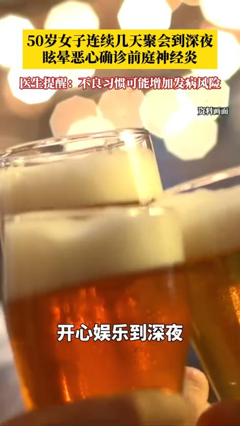“太吓人了!”近日,浙江绍兴,一50岁女子参加聚会K歌到深夜,不料高歌一曲后竟有些头晕,不过以为是唱得太用力就并没有在意,直到第二天起床突然天旋地转,还恶心呕吐,甚至需要家人搀扶才能坐起来,随后被紧急送医。网友:玩得太嗨了? 年底聚会是年末再常见不过的事情,辛辛苦苦忙碌一年,就等着年末的时候好好放松一下,大家都想着趁这热闹劲儿欢聚一番。金女士也不例外。 据媒体1月19日报道,年尾事情不忙,金女士便想着和同事好好聚聚餐,毕竟也忙了一年了。于是大家一起提议轮流做东玩几天。就这样一连几天下班后,大家一起酒吧,饭局,唱歌 各种娱乐活动玩不停,开心娱乐到深夜。 这天,金女士高歌一曲后,就感觉头晕恶心,以为是刚刚唱歌的时候喊的声音太大,一时缺氧导致的,就没太在意。直到第二天早上,她刚坐起来就感觉整个房间都在转,一转头就恶心,甚至坐起来都需要家人搀扶才行。 家人不放心,赶紧将金女士送到了医院。结果检查后发现是前庭神经炎发作。医生解释,前庭神经炎的病因复杂多样,主要包含病毒感染、血管性病毒和自身免疫疾病等,但也和不良习惯有关,比如过度疲劳、免疫力就会下降,连续熬夜也会让身体抵抗力急剧下降,病毒就容易入侵神经引发炎症。 金女士顿时悔不当初,本来想好好聚聚,没想到把自己聚进了医院!网友表示,就算是年轻身体也经不过连着几天的这么折腾啊! 信息来源:《50岁女子连续熬夜聚会K歌,突发眩晕恶心确诊前庭神经炎。医生提醒:长期熬夜、过度劳累等不良习惯或增加发病风险科普 健康 @DOU+小助手》惠州日报