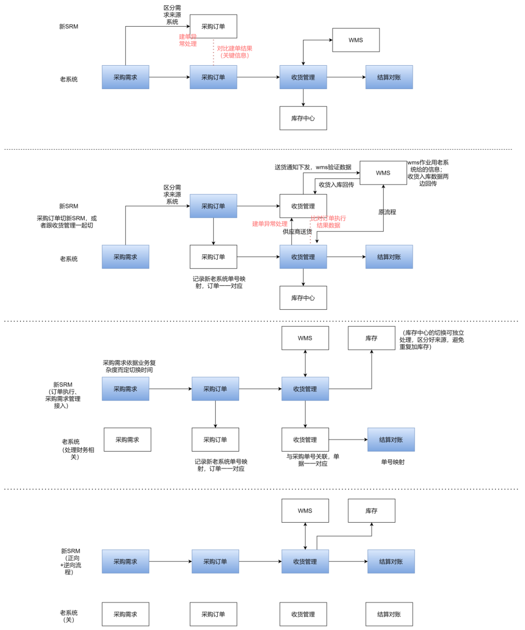 根据流程的先后,像结算对账常在月底,需要前置采购订单流程跑通后才到财务这块,所以先在老系统处理,也就是说,有一段过渡期,需要新SRM生成的订单回传老系统,在老系统做结算对账。