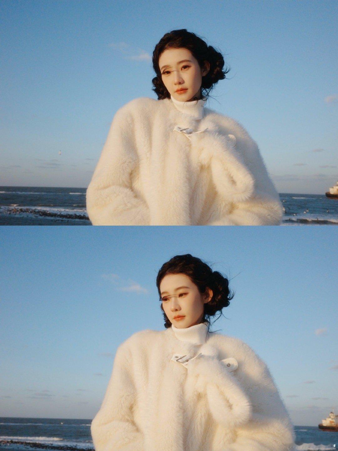 张艺凡咋萌成萨摩耶了 冬日海边本就浪漫,张艺凡的出现更添温馨。她像只萨摩耶般站在