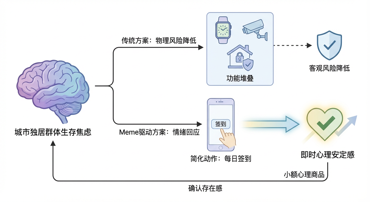 如果沿着传统产品思路切入,我们很容易想到解法:监测心率的智能设备、具备跌倒报警功能的硬件,或者更复杂的家庭安防系统。这些方案本身都很有价值,但它们的共同特点是“重”,它们试图通过功能堆叠,去降低客观的风险