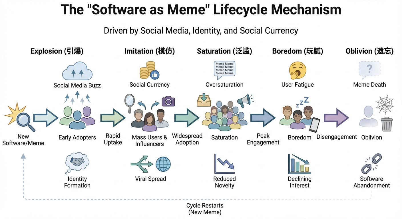 硅谷投资人AndrewChen曾提出过“软件即Meme”的观点,用来描述一类产品与社交文化之间日益紧密的关系。就是说,很多产品的生命周期,已经和社交媒体上一个“梗”的生命周期,完全绑定了。用户下载和使用你的产品,消费的不是产品功能本身,而是这个“梗”所带来的身份认同、社交货币和话题参与感