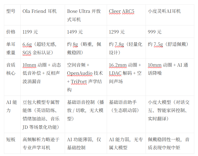 主要竞品:OlaFriend耳机、BoseUltra开放式耳机、CleerARC5、小度灵听AI耳机