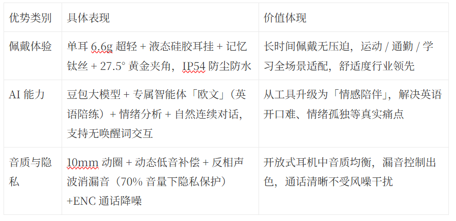 核心卖点:搭载字节豆包大模型的AI智能交互,超轻舒适的开放式设计,兼具优质音频、降噪与长续航。
