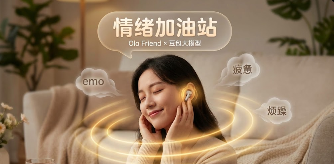 OlaFriend的「情绪加油站」是依托豆包大模型打造的随身情绪陪伴功能,无需掏出手机,通过语音唤醒就能在emo、疲惫、烦躁时获得即时的情绪支撑,把温暖陪伴装进耳机里
