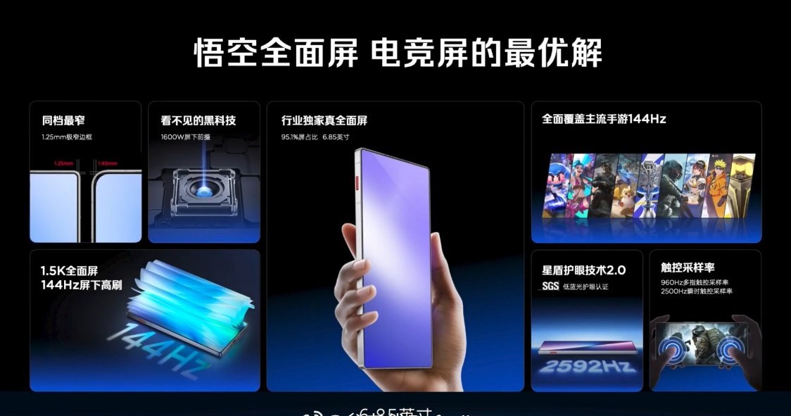 红魔 11 Air 采用一块 6.85 英寸 2480×1116 京东方 Q10 OLED 真全面屏,局部激发亮度 1600nit,支持 144Hz 刷新率、全局 960Hz 触控采样率、2500Hz 瞬时采样率,支持低亮度 2592Hz PWM 高频调光 + 高亮度类 DC 调光,屏幕边框 1.25mm。主要就是发光材料升级、刷新率给到了 144Hz。 ①【旗舰同款 悟空屏·真无孔】6.85英寸|95.1%屏占比|1.25mm极窄边框②【极致屏幕素质】1.5K全面屏 | 屏下144Hz | 多重护眼技术③【触控更灵敏】瞬时触控采样率2500Hz|多指触控采样率960Hz④【1600W屏下前置摄像头】屏下人像算法4.0红魔11Air