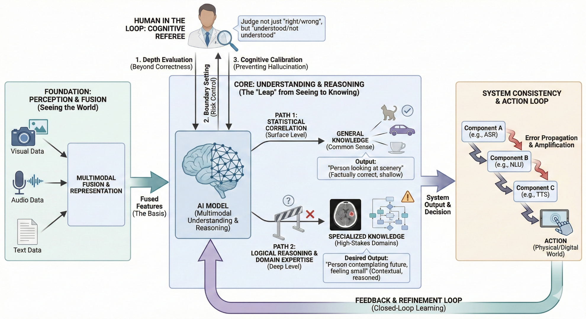 这个链路上的每一个环节,都可能产生误差。语音识别错了一个字,理解环节可能就谬以千里,最后合成出来的回答就牛头不对马嘴。这种误差的层层放大效应,在多模态系统里尤其严重。因为模态越多,链路就越长,不确定性就越大。这也是为什么,单纯提升某一个模型的能力是不够的,必须从系统层面去考虑一致性和鲁棒性。这也自然而然地把我们引向了下一个话题:光“理解”还不够,AI必须学会“行动”,通过行动的结果来验证和修正自己的理解,形成一个闭环。