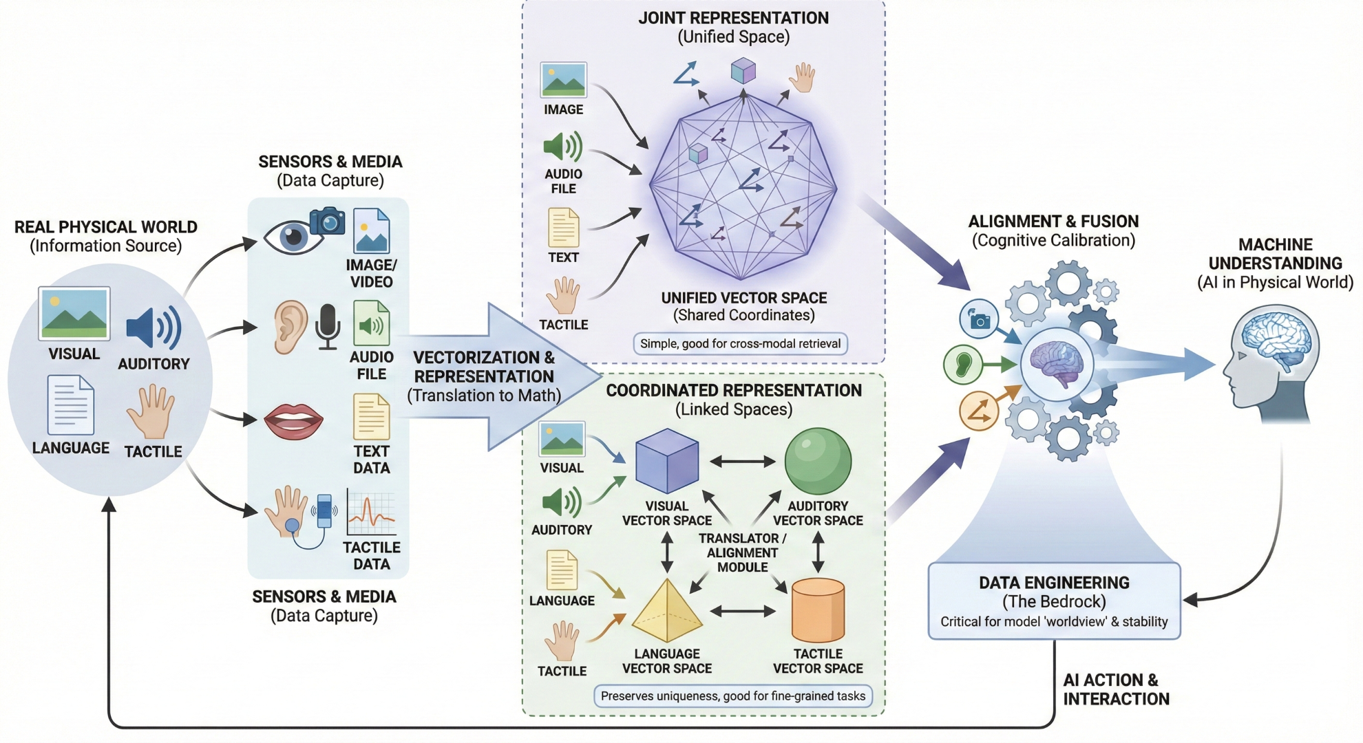 一种叫“联合表示”,就是不管三七二十一,把图片、文字、声音统统扔到一个巨大的“搅拌机”里,强制它们用同一种语言说话,也就是映射到同一个向量空间。这样做的好处是简单粗暴,便于模型进行跨模态的检索和生成,比如你输入文字“一只奔跑的狗”,它就能在那个统一的空间里找到最接近的图片向量。