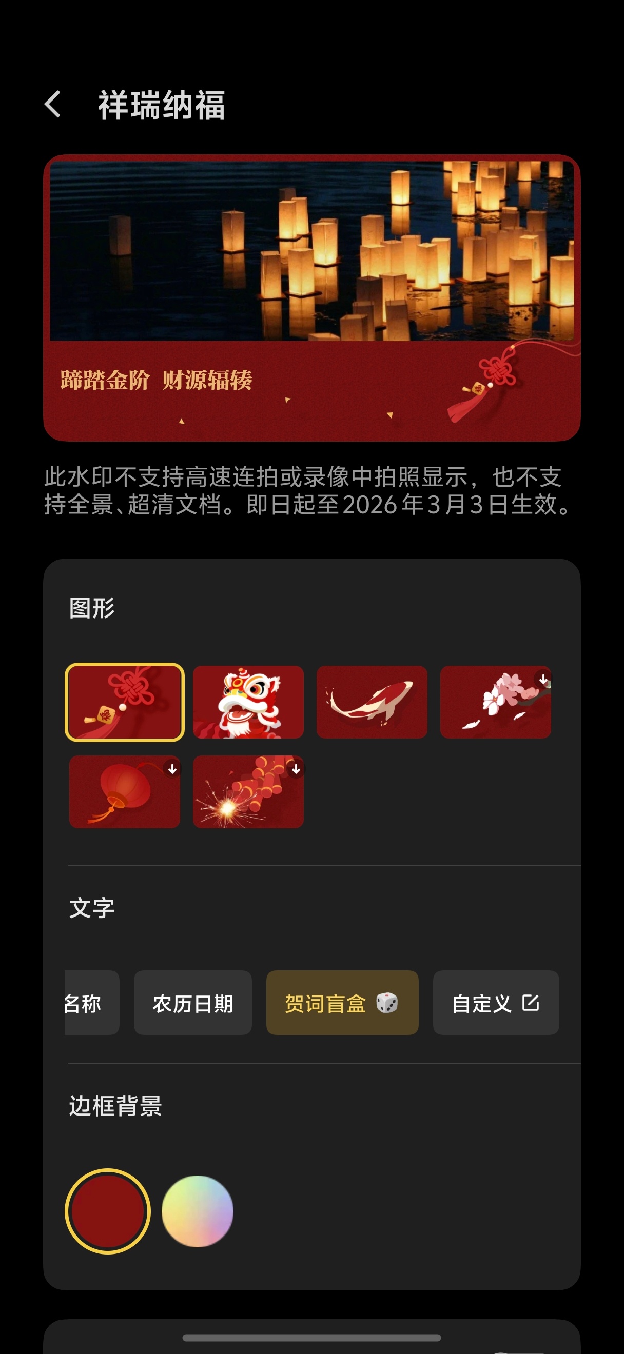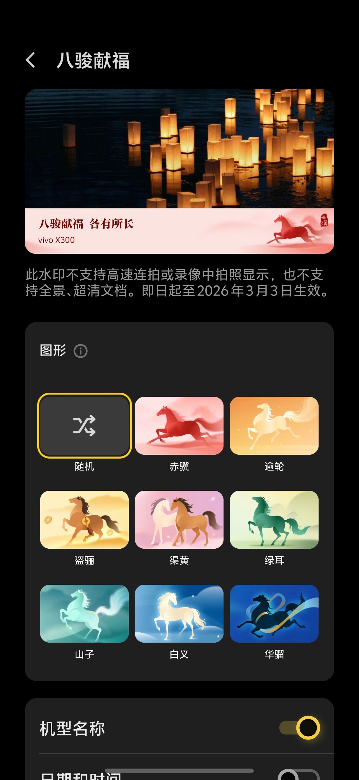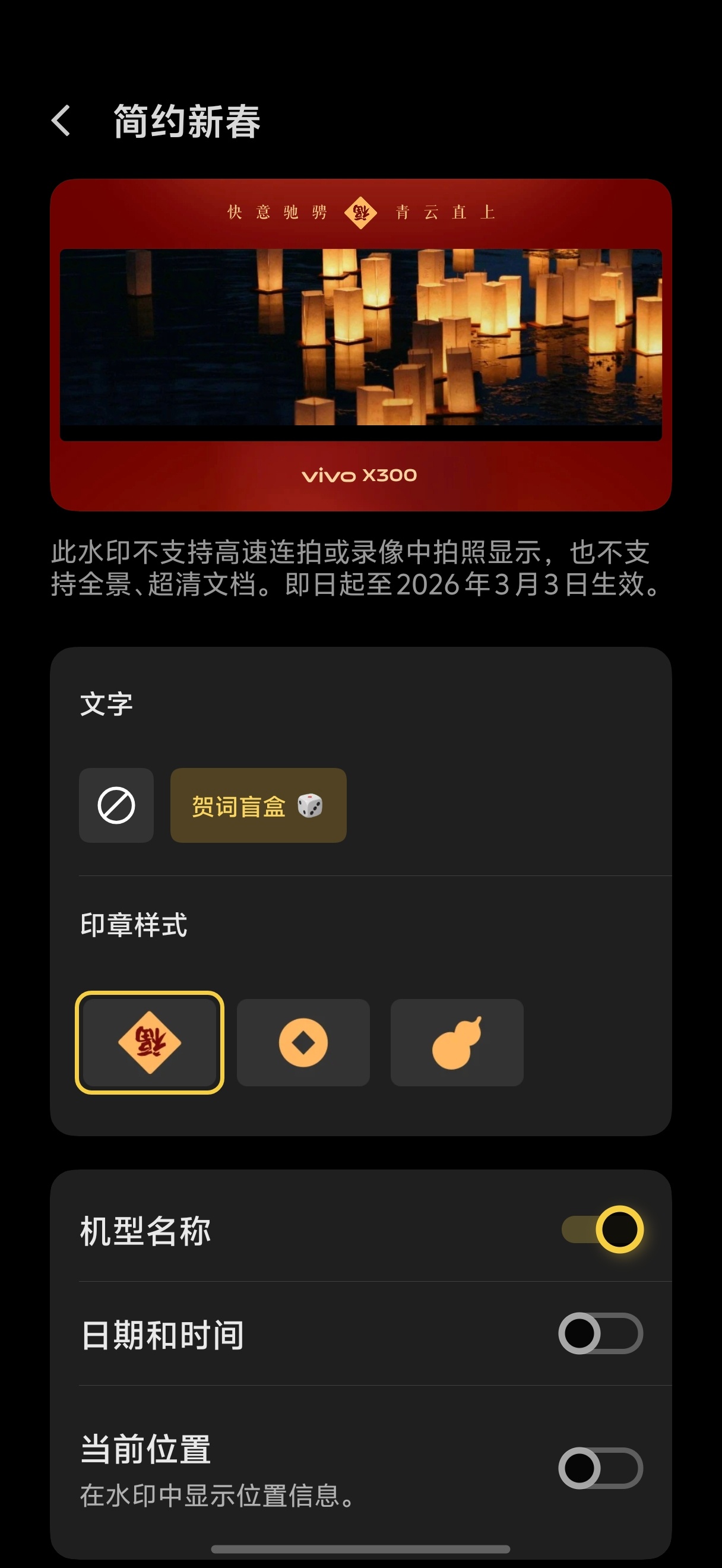 vivo X300系列春节水印都开始推送了,大家都更新没有?现在选择版本挺多的,每个版本可以自定义你选择喜欢的图案和文字,而且背景也可以更换,等会拍几张试一下效果