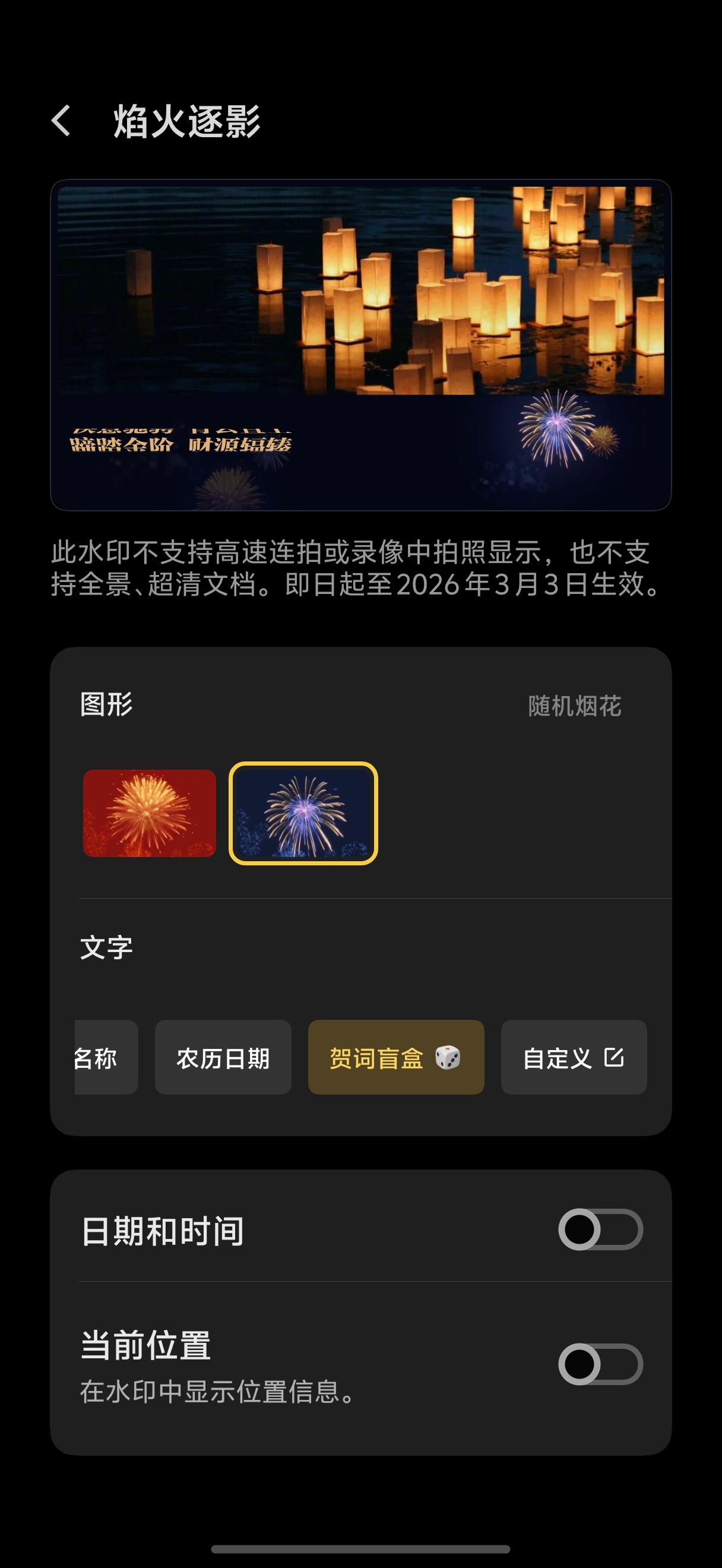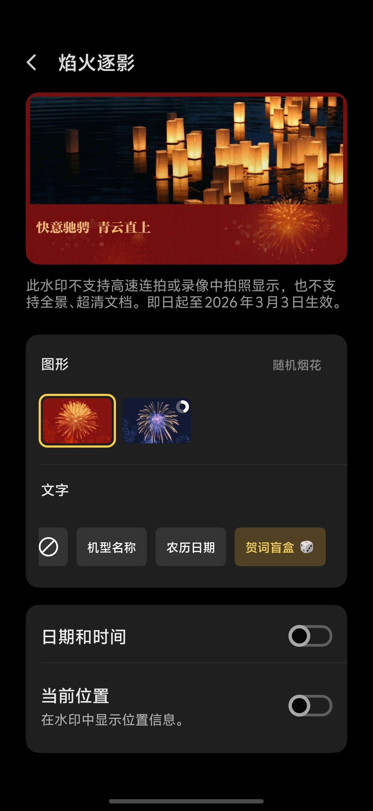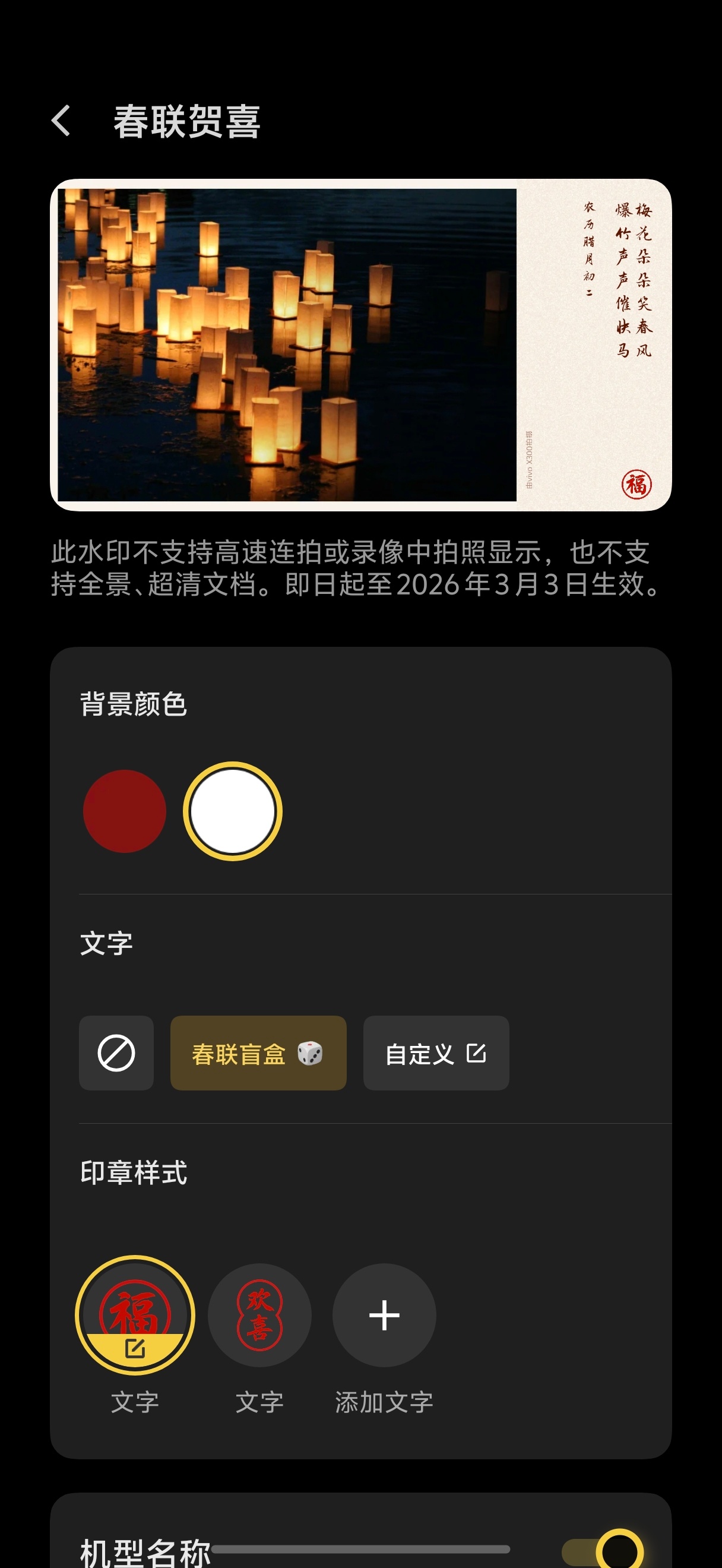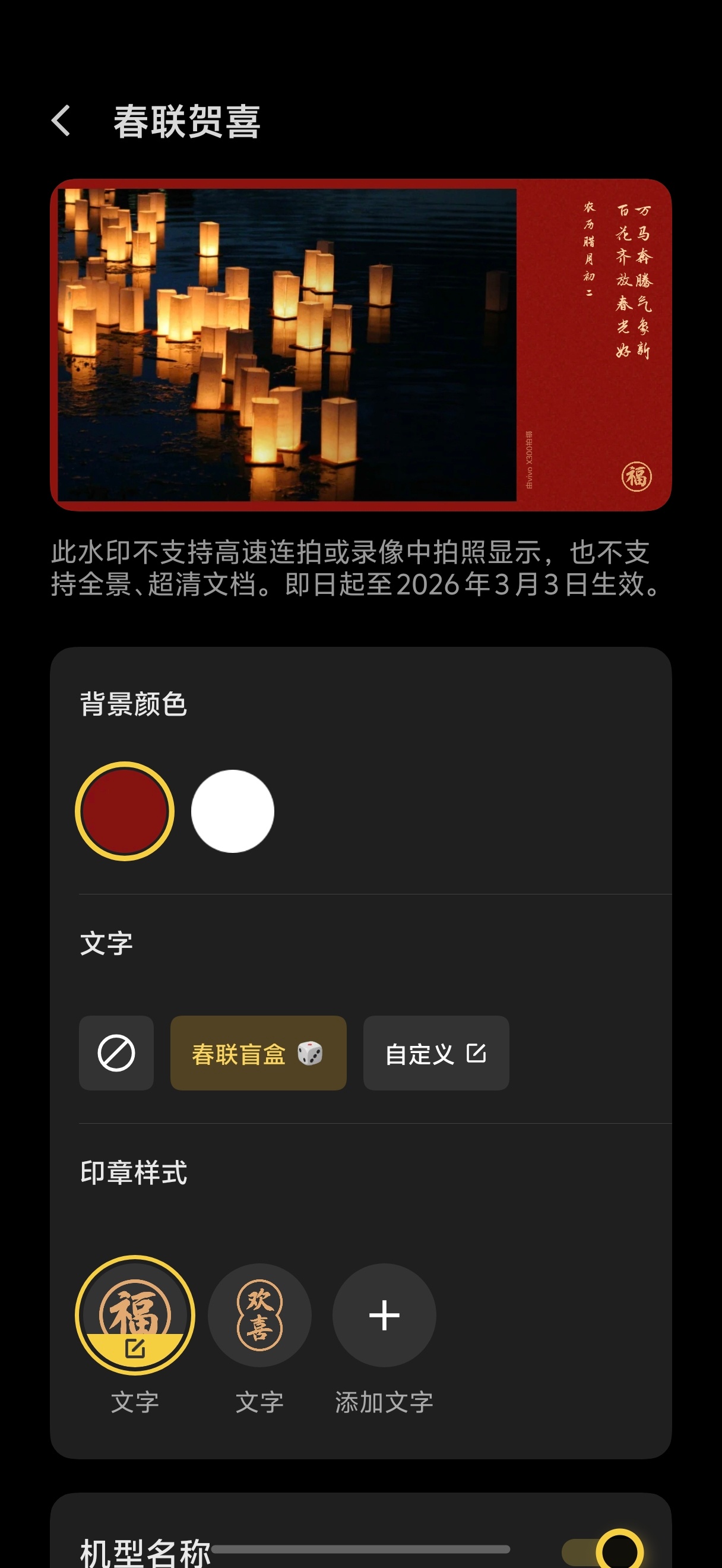 vivo X300系列春节水印都开始推送了,大家都更新没有?现在选择版本挺多的,每个版本可以自定义你选择喜欢的图案和文字,而且背景也可以更换,等会拍几张试一下效果