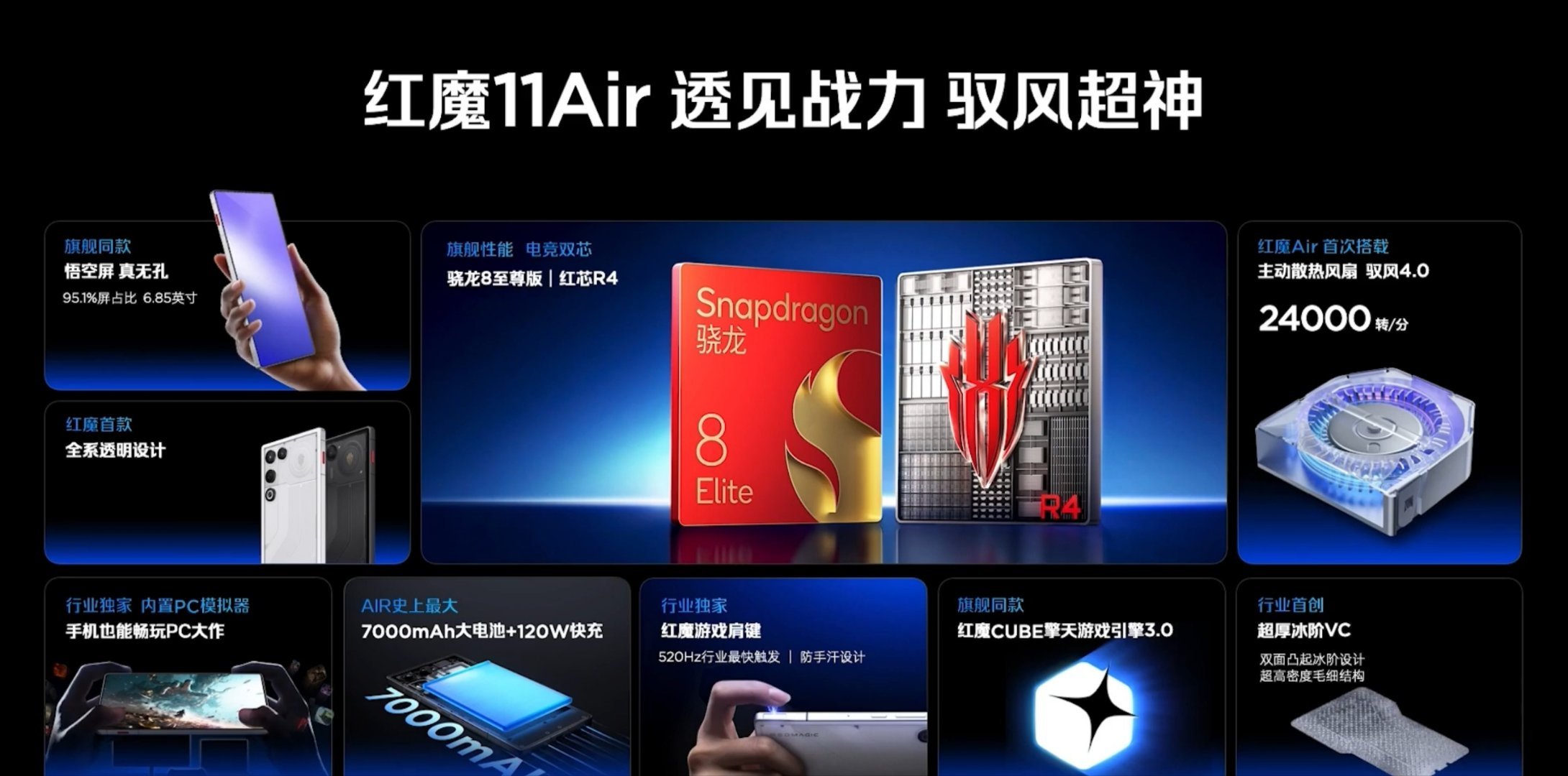 红魔 11 Air 正式发布:12+256GB 首销 3499 元(国补 2999 元)、16+512GB 售价 4199 元(国补 3699 元)- 芯片:骁龙 8 至尊版处理器,LPDDR5X Ultra 内存(9600Mbps),UFS 4.1 闪存,红芯 R4 自研游戏芯片(支持 2K 144Hz 超分超帧并发),ICE 魔冷散热系统(超厚冰阶 VC + 主动散热风扇 驭风 4.0),CUBE 擎天游戏引擎;- 屏幕:6.85 英寸 2480×1116 京东方 Q10 OLED 真全面屏,局部激发亮度 1600nit,支持 144Hz 刷新率、全局 960Hz 触控采样率、2500Hz 瞬时采样率,支持低亮度 2592Hz PWM 高频调光 + 高亮度类 DC 调光,屏幕边框 1.25mm;- 相机:前置屏下 16MP(豪威 OV16A1Q,1/3.06"),后置 50MP 主摄(豪威 OV50E40,1/1.5",OIS)+ 8MP 超广角(豪威 OV08F10,1/2.7")双摄;- 续航:7000mAh 牛魔王电池,支持 120W 快充,支持全场景充电分离;- 其他:厚 7.85mm,重 207g,有星尘白、量子黑、极光银 3 款配色,四等深微曲弧面透明玻璃后盖,铝合金金属中框,logo 风扇支持 RGB 灯效,配备 520Hz 独立 IC 触控双肩键,双立体声扬声器,东磁 0815 X 轴线性马达,USB 3.2 Gen 2,蓝牙 5.3,Wi-Fi 7、NFC、红外遥控、超薄光学指纹,搭载 REDMAGIC OS 11 系统。红魔11Air