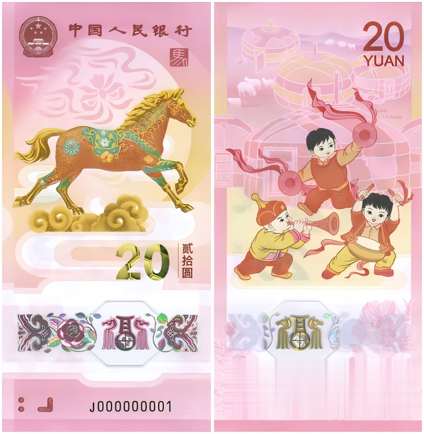 市面上人们说的“马钞”,通常指的是马年贺岁纪念钞:面额20元,票面长145毫米,宽70毫米,采用塑料材质,发行数量为1亿张(含留存历史货币档案2万张)。