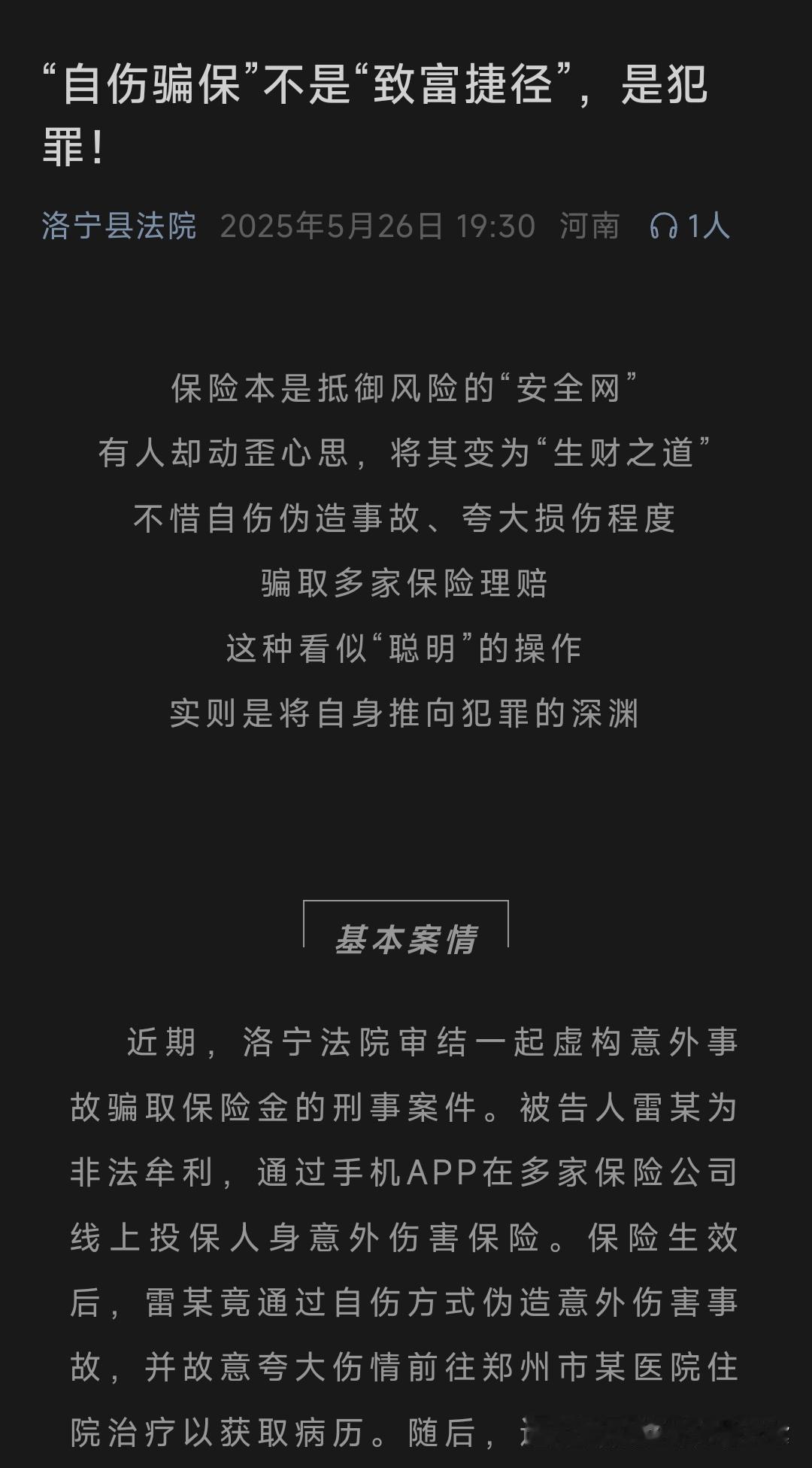 5 名外卖骑手钢管互砸手指,骗保 32 万获刑,这是怎么被发现的?如何看待该行为? 一次普通的送餐,一次“意外受伤”,申请数额可观的保险理赔金……在河北多地,外卖骑手“苦肉计”反复上演的背后,其实是一个精心策划、组织严密的保险诈骗团伙。 1月19日,记者从成都高新技术产业开发区检察院(下称“高新区检察院”)获悉,近日,经高新区检察院公诉,法院以保险诈骗罪分别判处被告人张某、邢某、崔某、仉某、魏某有期徒刑二年至六个月不等刑罚,部分适用缓刑,各并处罚金。这起涉及3家保险公司、涉案金额32万余元的系列保险诈骗案尘埃落定。 ------------------------------------ 1.很容易发现,而且想不发现都难。大数据时代,伤情、出险地点、出险率,多项数据综合起来,数据异常很明显。 保险本来就是基于大数法则而存在,故意制造事故会突破大数法则,事故率显著增加。 在数据化的现代,社会几乎是透明的,若要人不知,除非己莫为。 违法不被发现的可能性极低。 图片来源于残障之声公众号截图 图片来源于洛宁县法院公众号2.存在这种行为,是社会的悲哀,教育的失败。现代中国,温饱已成为必然,是什么驱动一个人对自己下手,以换取钱财? 这和卖肾换苹果手机,并没有本质区别。 克服恐惧并不容易,所以他们选择了互相动手。 何其惨烈。 而他们要的,究竟是什么? 人活一世,体验一世,除了饥寒暑热和疾病带来的痛苦,其他都不过是欲望在作祟。 合理管理自己的欲望,应该是每个人的必修课。 但,低欲望不利于消费,不利于资本流动。 所以各种商家不遗余力创造需求,通过视频、广告、软宣传洗脑,让人变成一个消费驱动型机器。 我想开豪车,所以需要忍受痛苦挣钱。 我想住大房子,所以需要忍受痛苦挣钱。 我想衣锦还乡,名誉加身,所以需要忍受痛苦挣钱。 …… 这些被社会创造的欲望,不停折磨着个人,不满足低收入,受不了太普通。 而网络环境各种炫富、鄙视低收入,更加让人感觉喘不过气,抬不起头。 …… 但是,这不对。 我们的传统文化,从来不是金钱至上。 我们的法制建设,一直在强调以人为本。 人本身,才是最金贵的。 学会爱自己,没有什么东西值得人伤害自己。