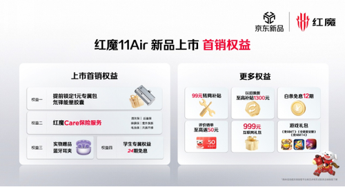 首销期间,用户下单即享专属福利:提前锁定1元专属包(红魔氘锋能量胶囊)、红魔Care保险服务、蓝牙耳机、99元转网补贴、以旧换新至高补贴1300元、999元互联网礼包、评价晒单至高返50元、《全明星觉醒》、《我叫MT》、《我叫MT4》等游戏礼包、白条免息12期、学生更有专属24期免息福利。