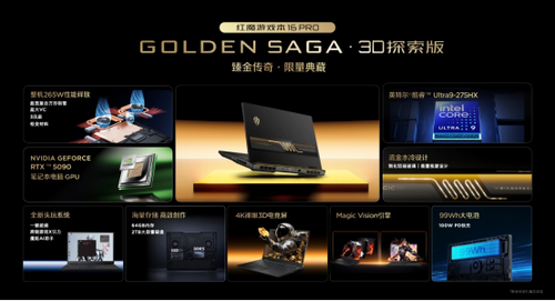 在游戏本上,红魔游戏本16Pro全新升级GOLDENSAGA·3D探索版,搭载英伟达5090显卡,拥有64GB+2TB存储,并且首次在笔记本上带来了流金水冷设计。