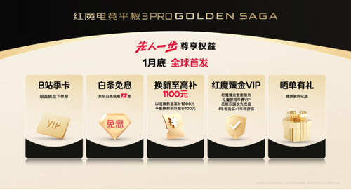而红魔电竞平板3Pro臻金传奇同样搭载24GB+1TB的顶配存储组合,配备红魔11Pro+臻金传奇同款臻金装备,预计1月底全球首发,上京东先人一步首销尊享B站季卡、12期白条免息、以旧换新至高补贴1100元,红魔臻金VIP、晒单有礼等权益。