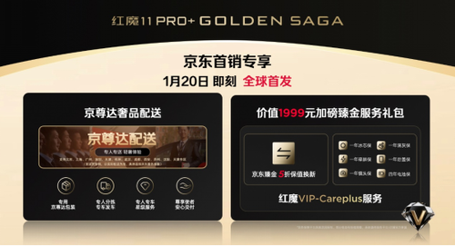 红魔11PRO+臻金传奇在京东首销期间,还可专享:京尊达奢品配送、价值1999元的VIP-Careplus服务、5折保值换新,以及长达四年的电池保等全方位保障。