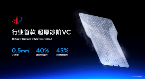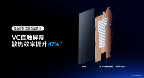 除了主动散热之外,红魔也带来了行业首款超厚冰阶VC,通过结构加厚与双面凸起设计,让蒸汽空间提升了40%,均热能力提升45%。同时也让VC均热板直触屏幕,散热效率提升了47%。
