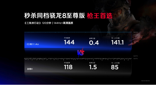 在发布会上,红魔官方也展示了红魔11Air的游戏实测水平。在144Hz高清画质下运行120分钟《三角洲行动》,红魔11Air平均帧率为144帧,1%LOW帧为141.1帧,对比机型平均帧率为118帧,1%LOW帧为85帧。