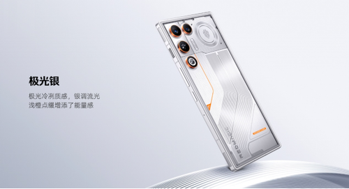 外观设计上,红魔11Air带来星尘白、量子黑、极光银三款潮流配色,在延续红魔独有的透明美学的基础上,首次采用全系透明机身设计,并将黑胶唱片的复古质感、赛车跑道的速度激情与几何图形元素融入其中,搭配3D弧形玻璃后盖,既彰显极致科技感,又保证了舒适的握持手感。同时标志性的背部RGB灯得到保留,进一步提升电竞氛围。