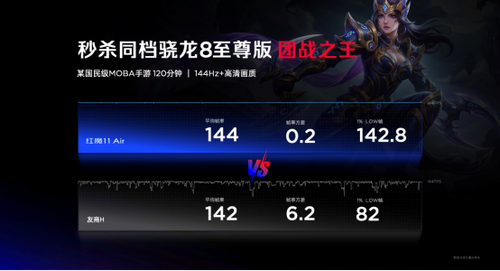 在144Hz高清画质下运行120分钟某国民级MOBA手游。红魔11Air平均帧率为144帧,1%LOW帧为142.8帧,对比机型平均帧率为142帧,1%LOW帧为82帧。
