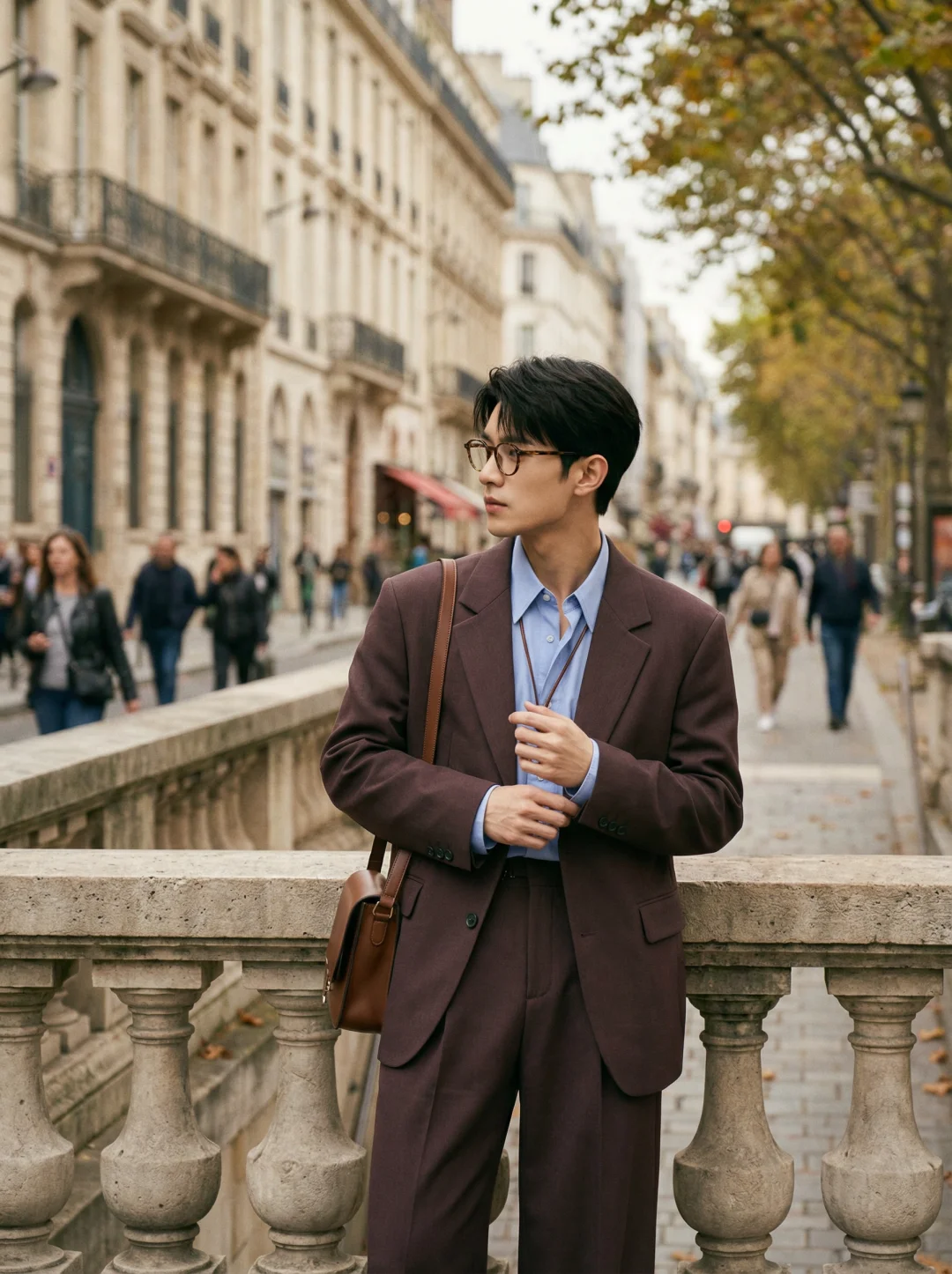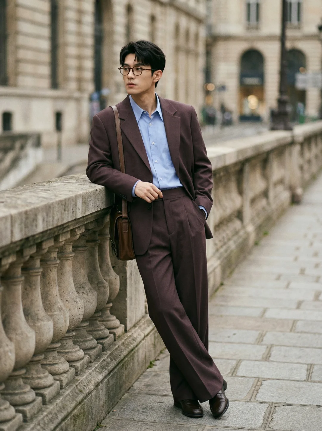 内搭浅蓝衬衫:清爽的浅蓝色衬衫是提亮神器,与棕色西装形成温柔的撞色,显得干净又儒雅。敞开的领口,是恰到好处的松弛感。
