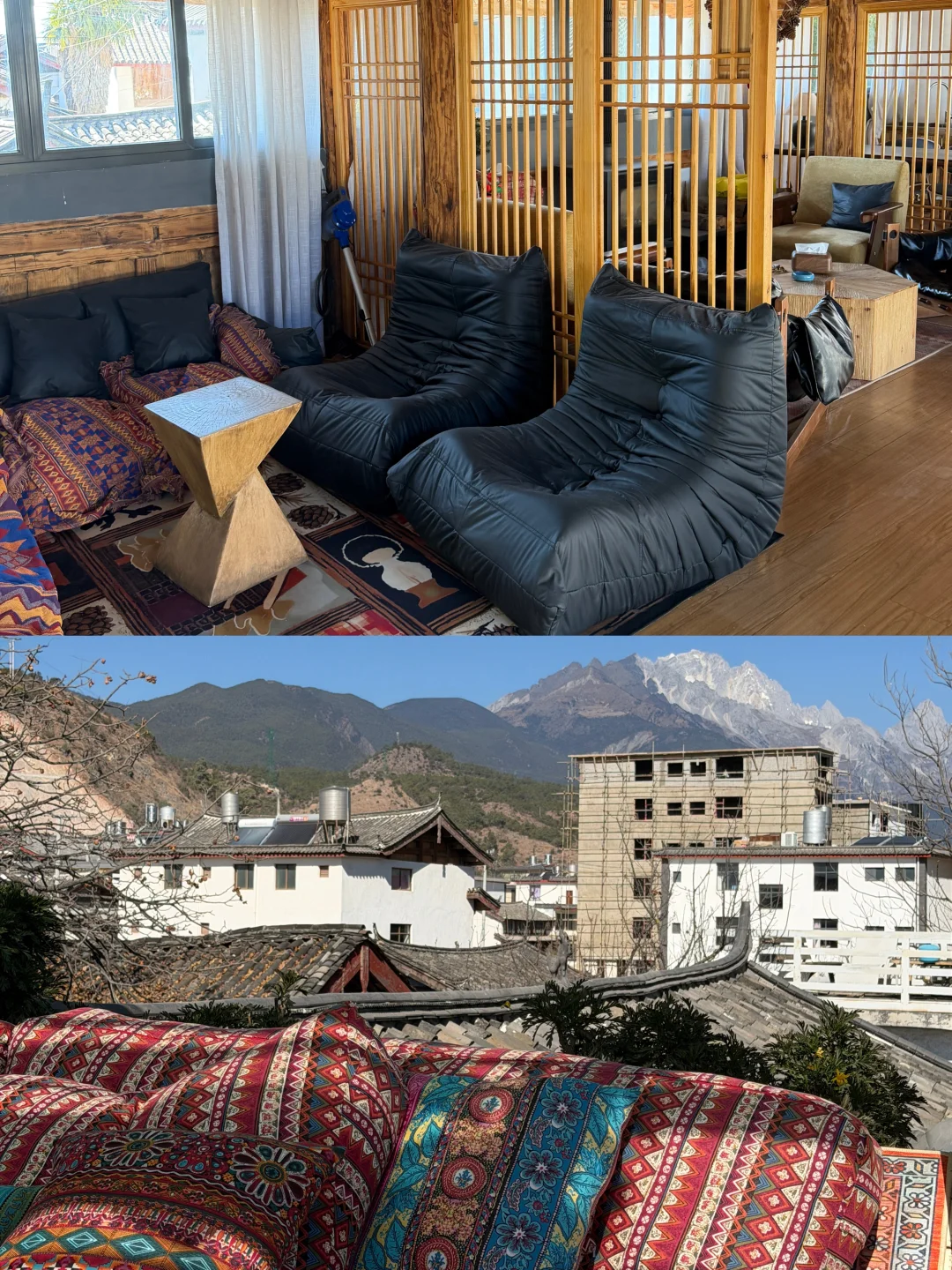 ✅ 最绝的是顶楼露台!抬头就是玉龙雪山全景,傍晚晚霞染红天际,手机原相机直出都是壁纸级大片📸 根本不用修图!