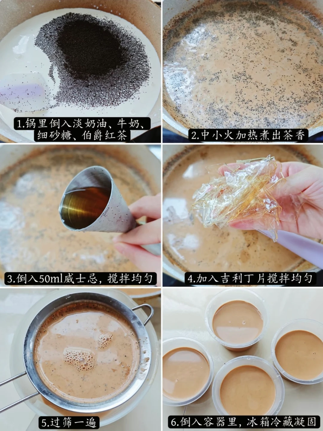 牛奶500ml|淡奶油150ml|威士忌50ml|伯爵红茶10g|吉利丁片10g|细砂糖30g