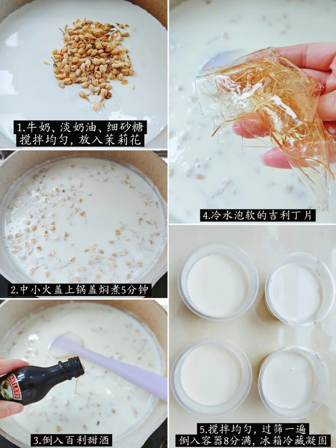 牛奶400g|淡奶油150g|细砂糖35g|干茉莉花8g|吉利丁片12g|百利甜酒 50g