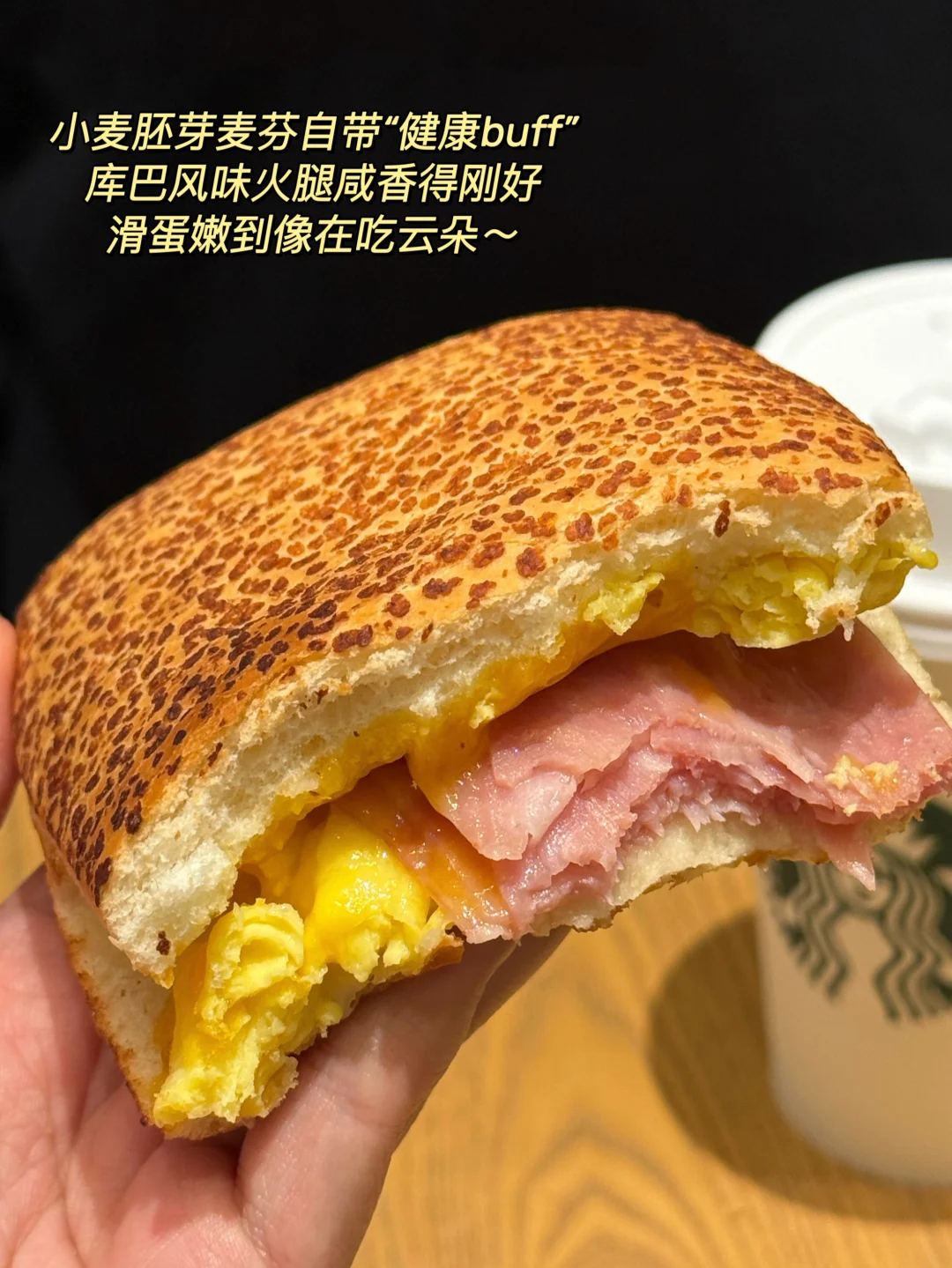小麦胚芽麦芬自带“健康buff”,库巴风味火腿咸香得刚好,滑蛋嫩到像在吃云朵~ 吃完毫无负罪感,学生党、打工人揣着它,感觉能扛过一整天的工作💪🏻!